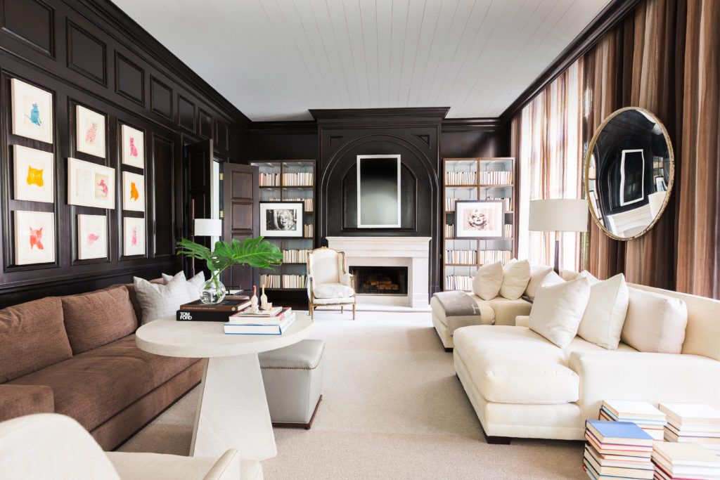 Not one to do anything halfway, James went so far as to turn the shelved books in the room backwards, which assuaged the homeowner’s guilt about not reading them. To downplay their presence even further, he hung iconic Bert Stern photographs in front. At the opposite end of the room, Andy Warhol’s colorful cat sketches add a lighthearted touch to the conversation area.