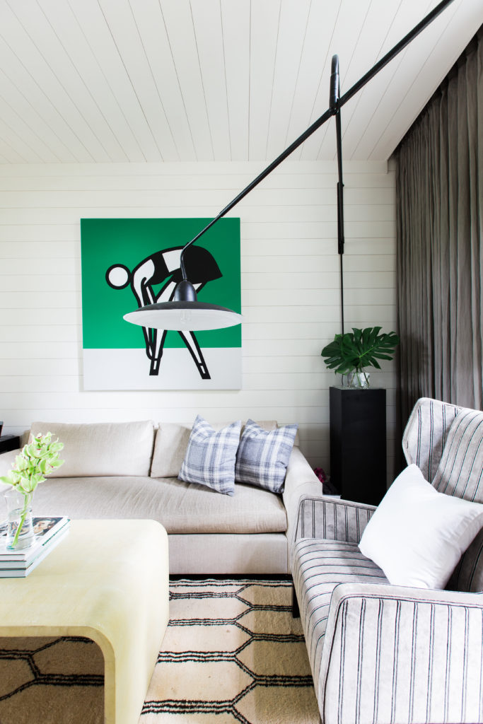 Off the kitchen is the “keeping room” using the old-fashioned term. “I knew right away that this was where Julian Opie’s “Woman Dressing” should be,” says James. A bold piece, it’s strong enough to hold its own against the various geometrics and textures at play, including a Turkish rug, vellum coffee table, and mohair-covered chairs and pillows, all which help to make it the most utilized room in the house.