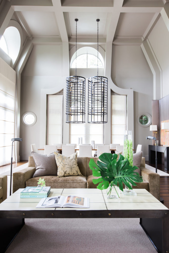 The 28-foot-high ceiling of the informal dining room demanded mass but not weight when it came to lighting fixtures, and was achieved with the silo-style pair by Coup d’Etat, originally floor lamps. The Constantini table of grained walnut is surrounded by Artistic Frame chairs.