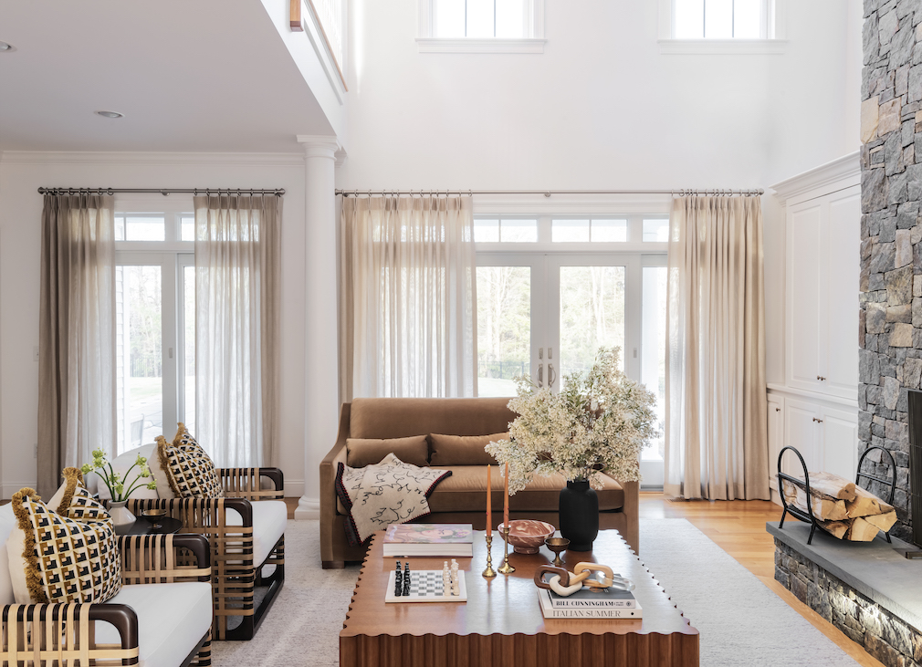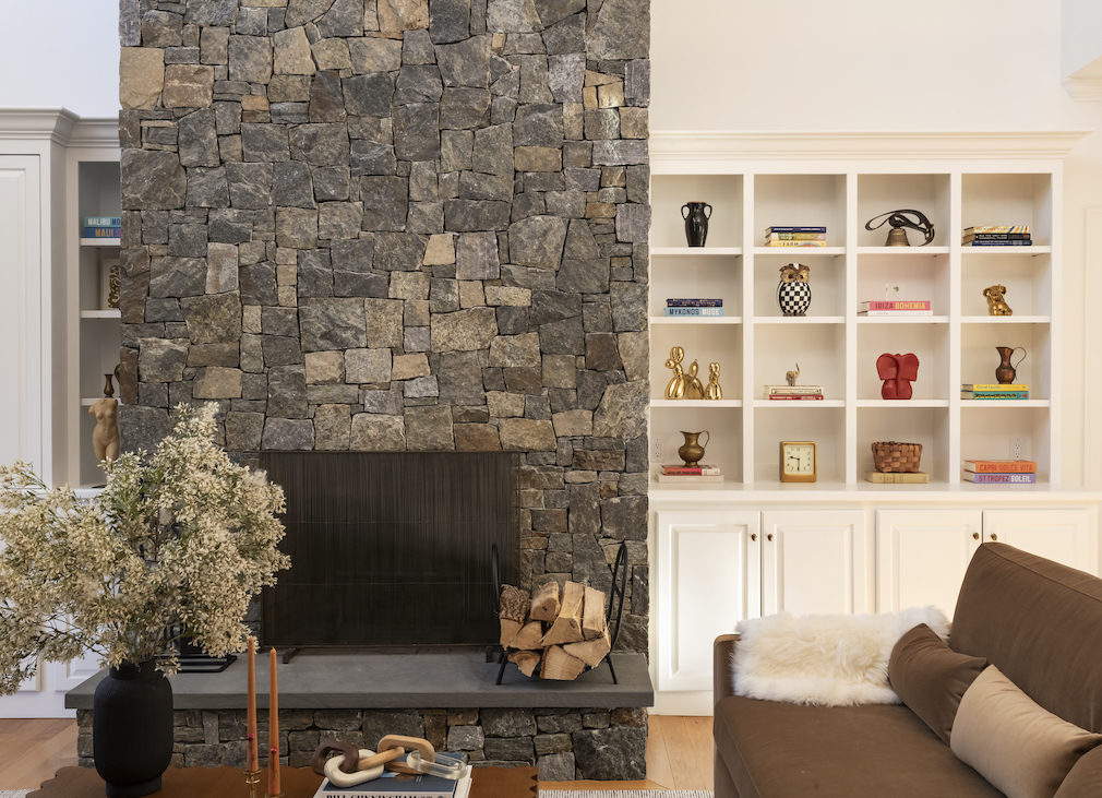 Of course, the project was also a juxtaposition between Miranda and her clients. At the beginning, the couple selected a few furnishings – such as the Phillip Jeffries wallpaper in the office and a Perigold rug that covers the blue-tinged bedroom – and Miranda was tasked with tying the space together. Despite gravitating toward contemporary finishes, the couple didn’t want to strip the home of its sense of place and decided to preserve the living room’s supersize stacked-stone fireplace.