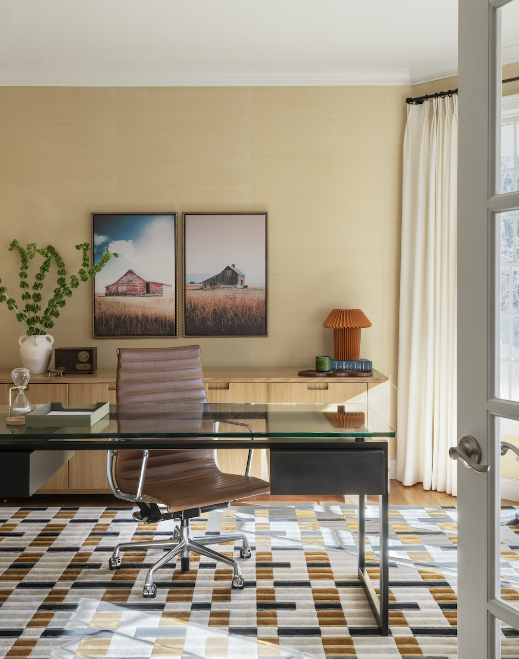 While the drenched bedrooms might zero in on one shade, Miranda brought a vibrant spirit to the home office, tapping Sacco to create the office’s custom rug, which is largely inspired by a fabric swatch she showed her clients. For balance, she offset the unmissable underfoot with butter-yellow wallpaper, a Līmen Studio credenza and a desk from RH paired with a chair sourced from Design Within Reach. “I think it’s okay to have one big element as long as you manage it with the right textures and colors,” Miranda explains. “Even though the rug is very loud, everything else is very quiet and subtle.”