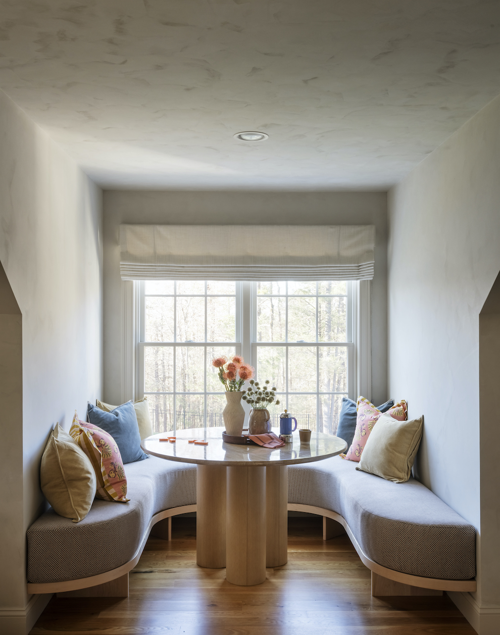 But while bold décor is often synonymous with bright colors and hypnotic patterns, Miranda offers a soft side in the home’s bonus room. Here, she transformed a small nook into a relaxed spot where her clients could work and answer emails at their leisure. The alcove might seem casual in nature, but a custom, curved banquette from Smoke Ridge LLC and a coat of limewash by Portola Paints keep it streamlined and sophisticated. The result? The quiet, relaxed comfort of the countryside – but on modernists’ terms.
