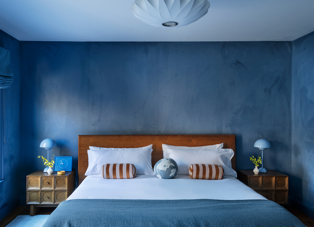 While the living room celebrates togetherness – whether it’s bringing people together or pairing two different styles in one space – the home’s private spaces play with unbridled boldness: Miranda has evoked a “cozy, encompassed environment” by color-drenching the bedrooms. In the blue room, which is occupied by the couple’s older son, the designer paired a “suede” wallcovering from Phillip Jeffries with a duet of cornflower-hued table lamps from &Tradition, as well as trim in a custom blue from Benjamin Moore. “The wallcovering has this extra dimension that almost looks like it’s lime-washed, but it’s not,” she describes. “The monochromatic touches keep everything consistent.”