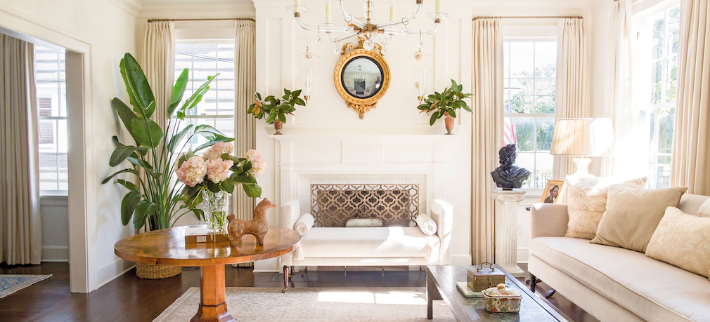 “The house, a classic Charleston ‘single’ across from an old horse lot, was in great shape. The clients updated and painted when they first moved in and it felt fresh with shades of white on the walls, but blank. So, most of the work I did was decorative,” Ralph notes. Her additions included paneling above the fireplace and new hearth and crown moldings. She found a brass fire screen that plays nicely with the original mantelpiece.