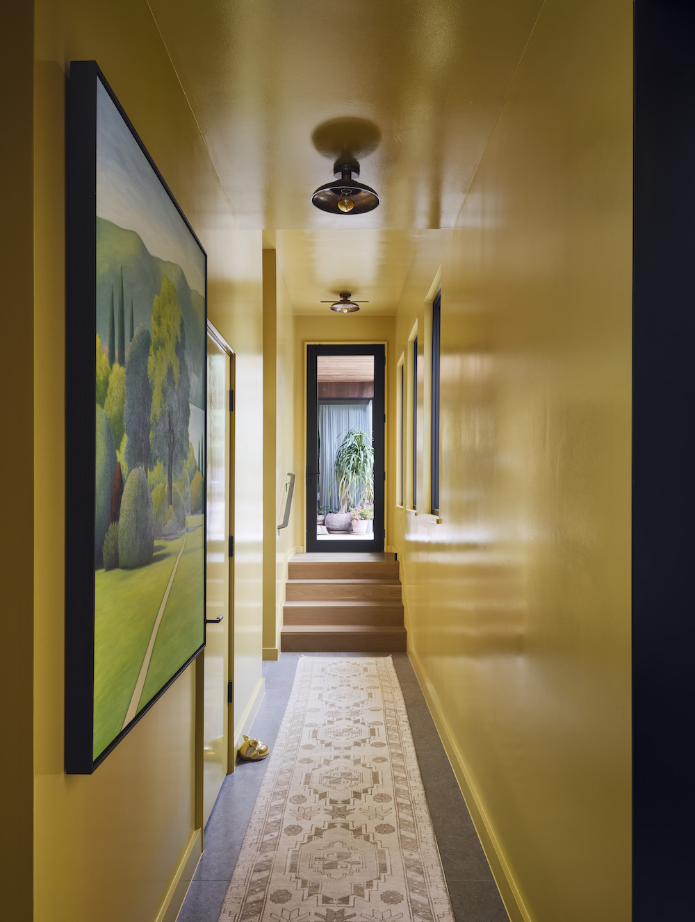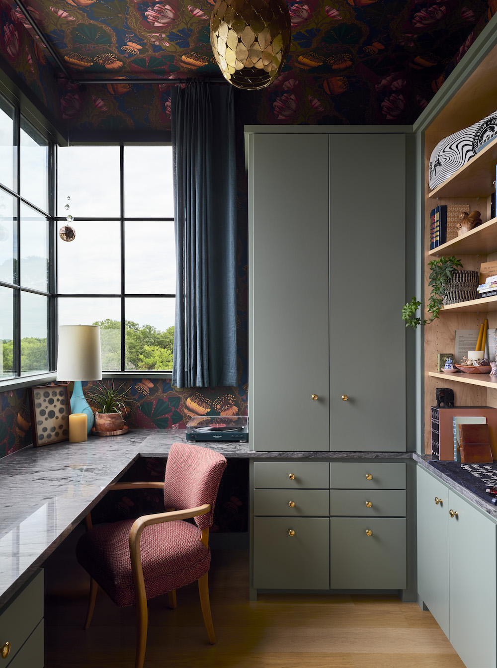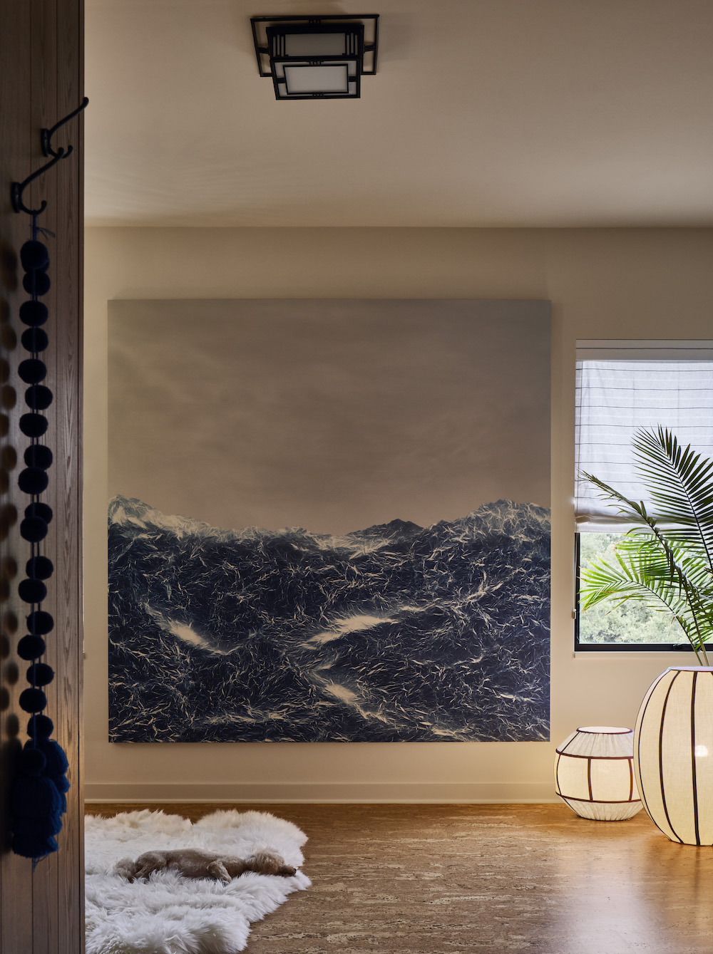 - A custom origami totem light fixture by artist Karen Hawkins floats in the stairwell as a sculptural centerpiece