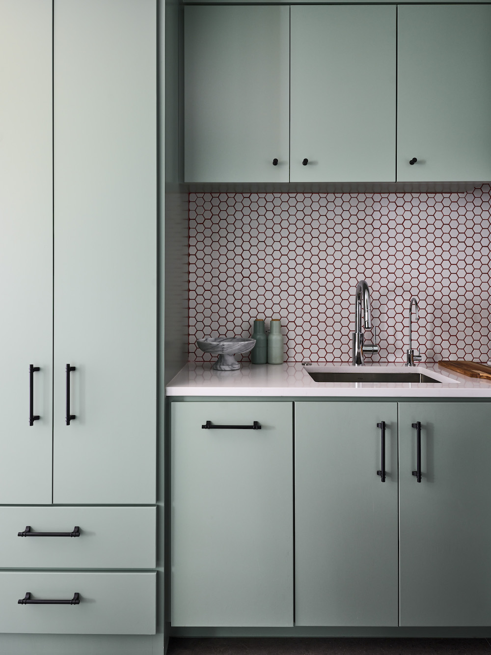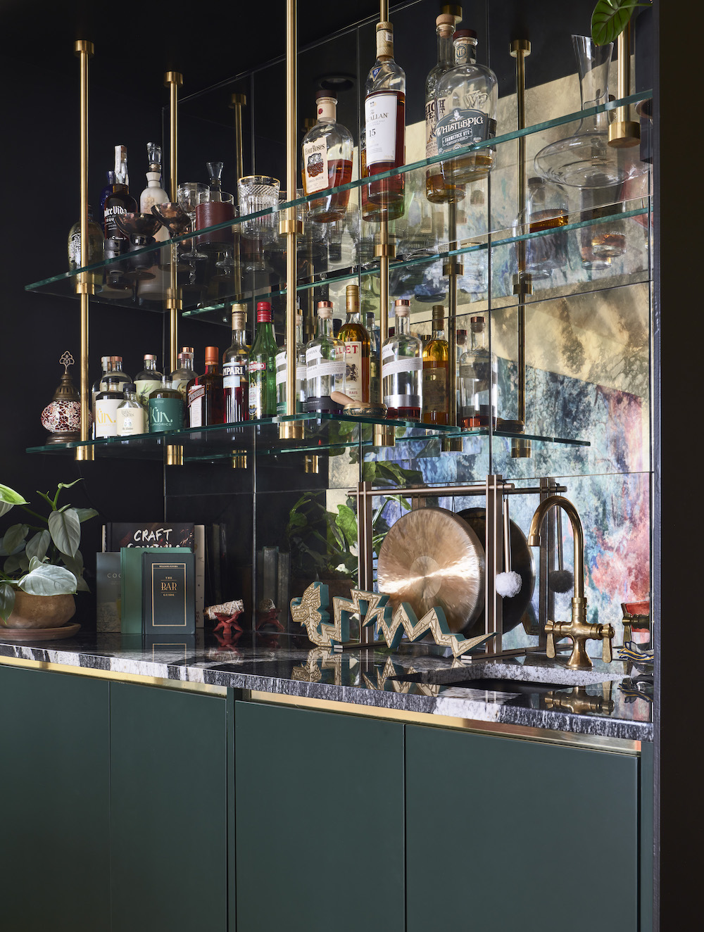 - The home’s bar area features Boomtown’s handcrafted bronze and glass accents