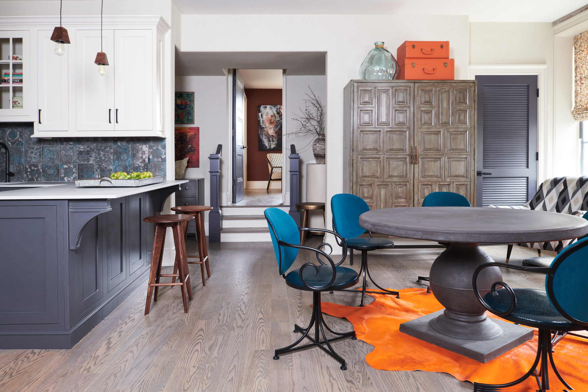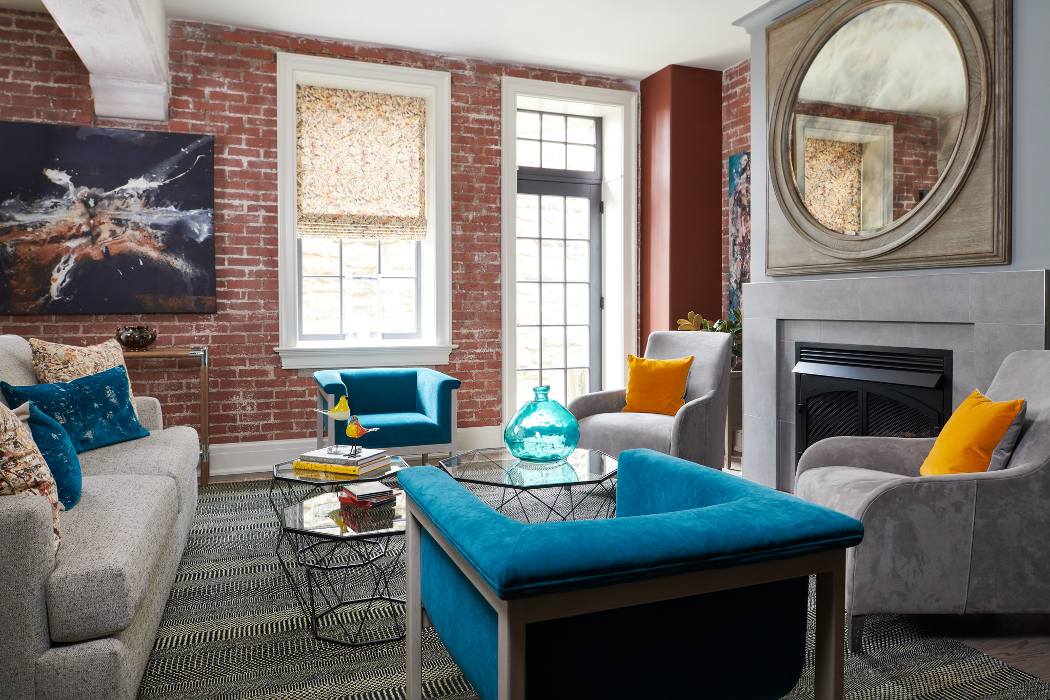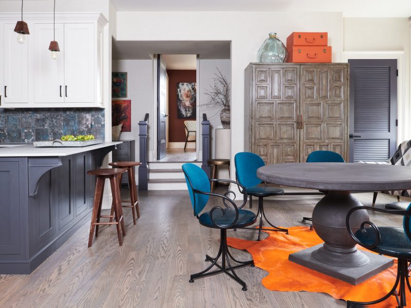Integral to achieving the right tone are the large statement pieces Ciardi used to anchor the individual spaces; including the mirror hung over the fireplace, and the chandelier by Tightrope that fills the stairwell.