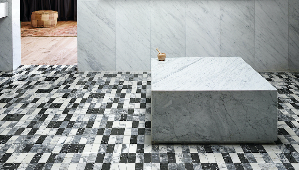 “In developing a collection with Bisazza, we were deeply inspired by Italy itself, where each region offers an extraordinary variety of marble with its many colors and styles,” share Fournier and Marty. “As architects and connoisseurs of understated elegance, we pay tribute to this treasured mineral through a reworking of modern domestic concepts that transforms the traditional aesthetic customs, uses and, often, functions of marble.”