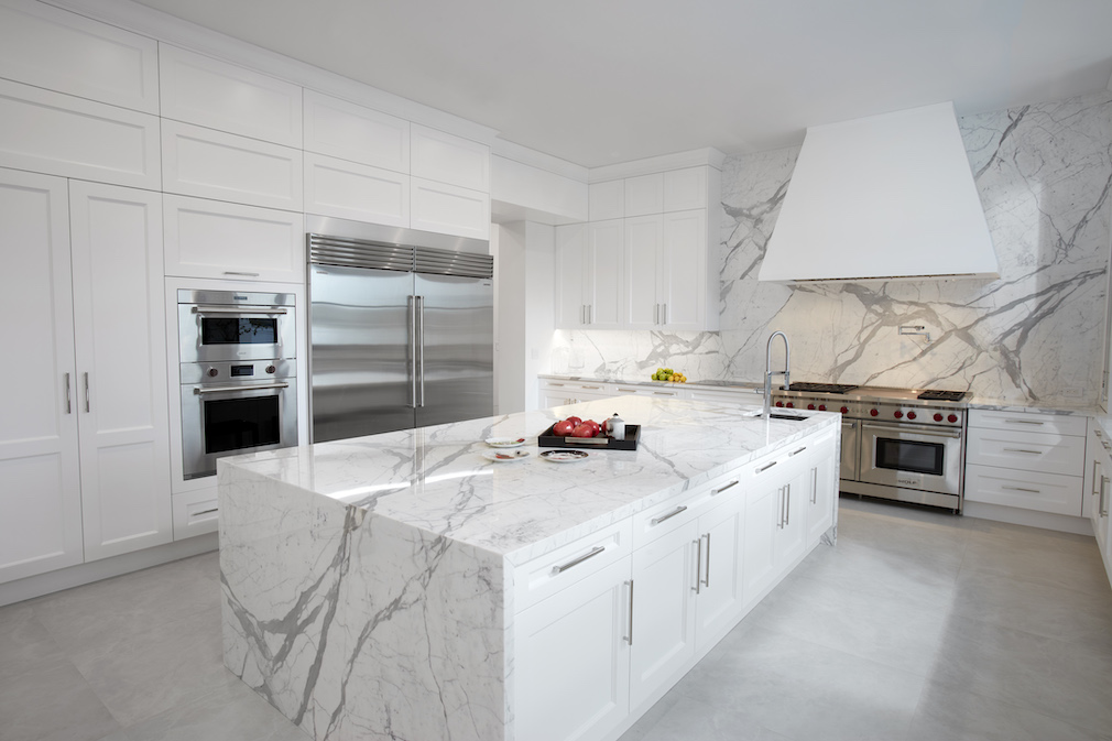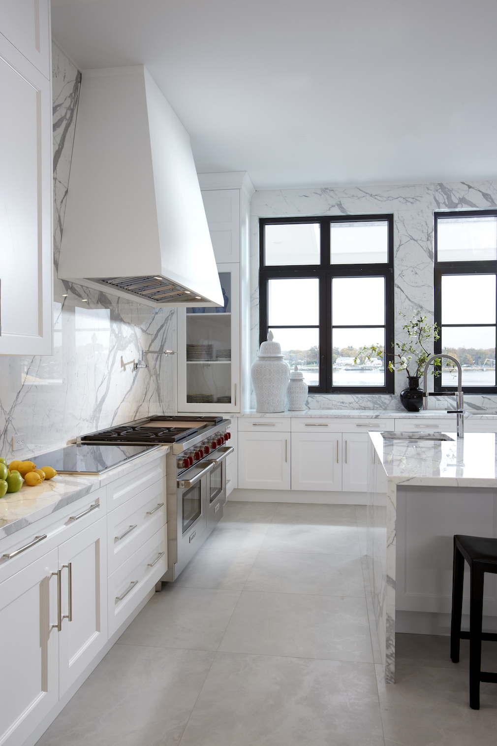 Though the kitchen’s crisp palette offers a blank canvas for all the gatherings that’ll take place here, Neocleous wanted to add some warmth to the mostly white space. While the marbled accents and glass-fronted cabinets create an inviting atmosphere, the appliances keep the space from feeling sterile.