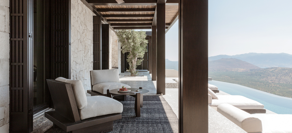 Perched high on a slope with vistas stretching to the sea, this earth-hugging home in the northern foothills of Crete’s Thrypti Mountains seems as elemental as the landscape around it. Designed by the Athens-based architecture firm, Block722, it combines a sophisticated program – home cinema, gym, a billiard room and bar area – with a deep respect for natural materials and craftsmanship. Situated to guarantee that every room offers a view, the property is firmly oriented to the outdoors, outfitted with spacious terraces and a swimming pool.