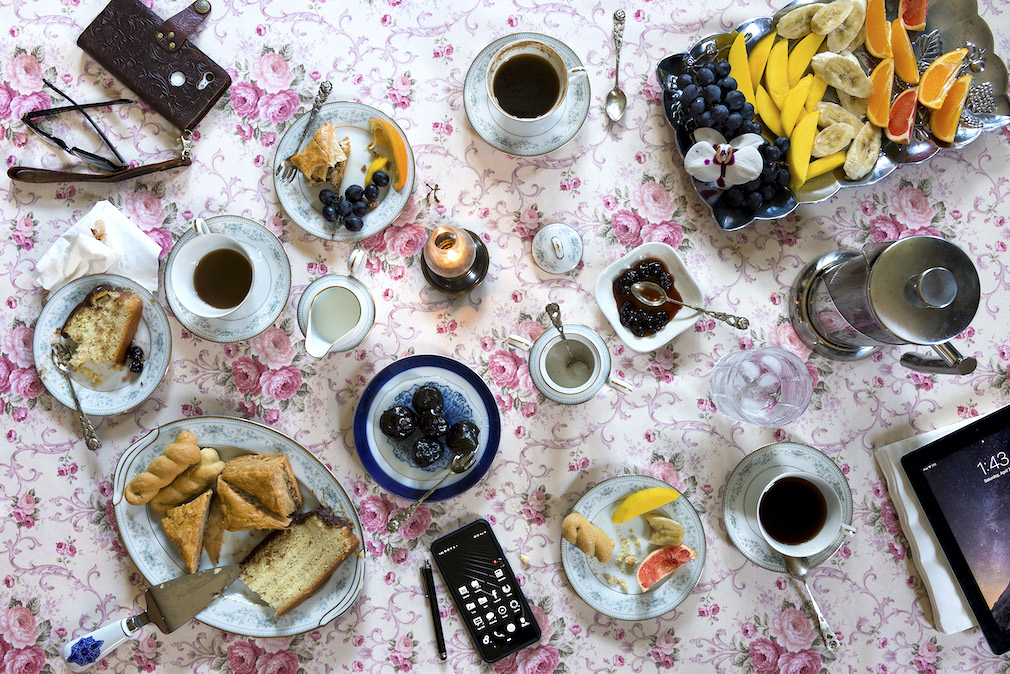 In each composition, we see food and drink, car keys and cell phones – the very basics of our modern lives existing in harmony. The elements remind us that such intimate and personal gatherings and “conversations” are not strictly things of the past; they can happen still today, even amid all our technology and quick text chats. Equally significant is the visual absence of the humans at the table, an artistic decision that invites the viewer to imagine the dinner guests and the dialogue that enlivened the tablescapes.