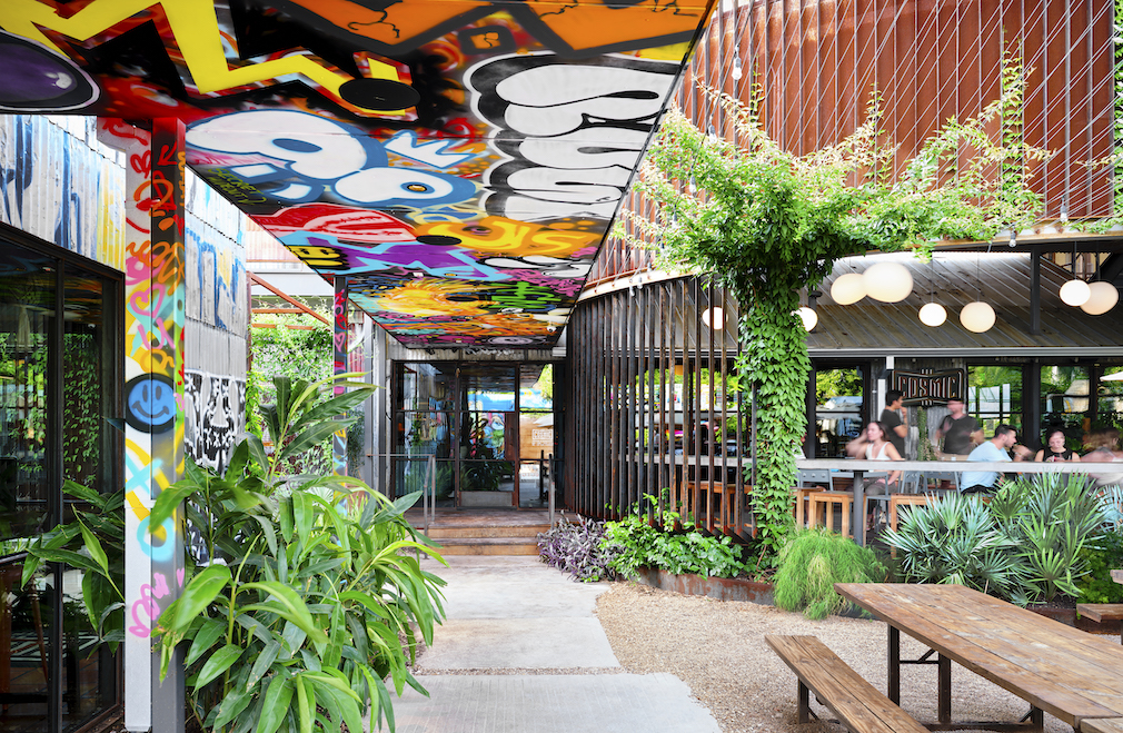 The historic warehouse buildings retain their corrugated steel siding, wood-framed windows, and metal roofing. Additional materials throughout the site are durable and honest, meant to weather and patina with time. A feature architectural element of the complex is a new 30-foot tower providing access to the second-level balcony. Surrounded by steel mesh, the tower is activated in the evening and nighttime hours, showcasing a custom mural. To blend the historic and new fabric more seamlessly, the design team collaborated with local graffiti artist Miles Starkey who introduced new graffiti and murals on strategic building elements including an awning, the tower and a new wall marking the edge of the outdoor patio. In 2023, Cosmic invited numerous artists to celebrate the life of local artist Daniel Jonston by painting the street-facing fences along the entire property. This colorful, organic, and gritty character carries through the entire property.