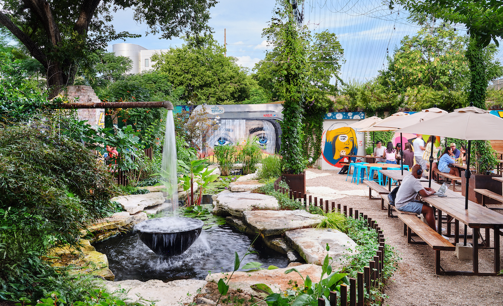 Located in a highly developed part of East Austin, two warehouse buildings long abandoned are now a thriving morning-to-night restaurant and bar. The buildings were constructed in the early 1900s and used by Texas Company, or Texaco, to hold petroleum products delivered by railcars and dispensed in trucks throughout Austin. Today, thanks to the design work of Clayton Korte, they are the second location of a city favorite: Cosmic Coffee & Beer. As a rare remnant of the industrial past of the area, it is a spot full of history and graffiti added over the course of the last century.