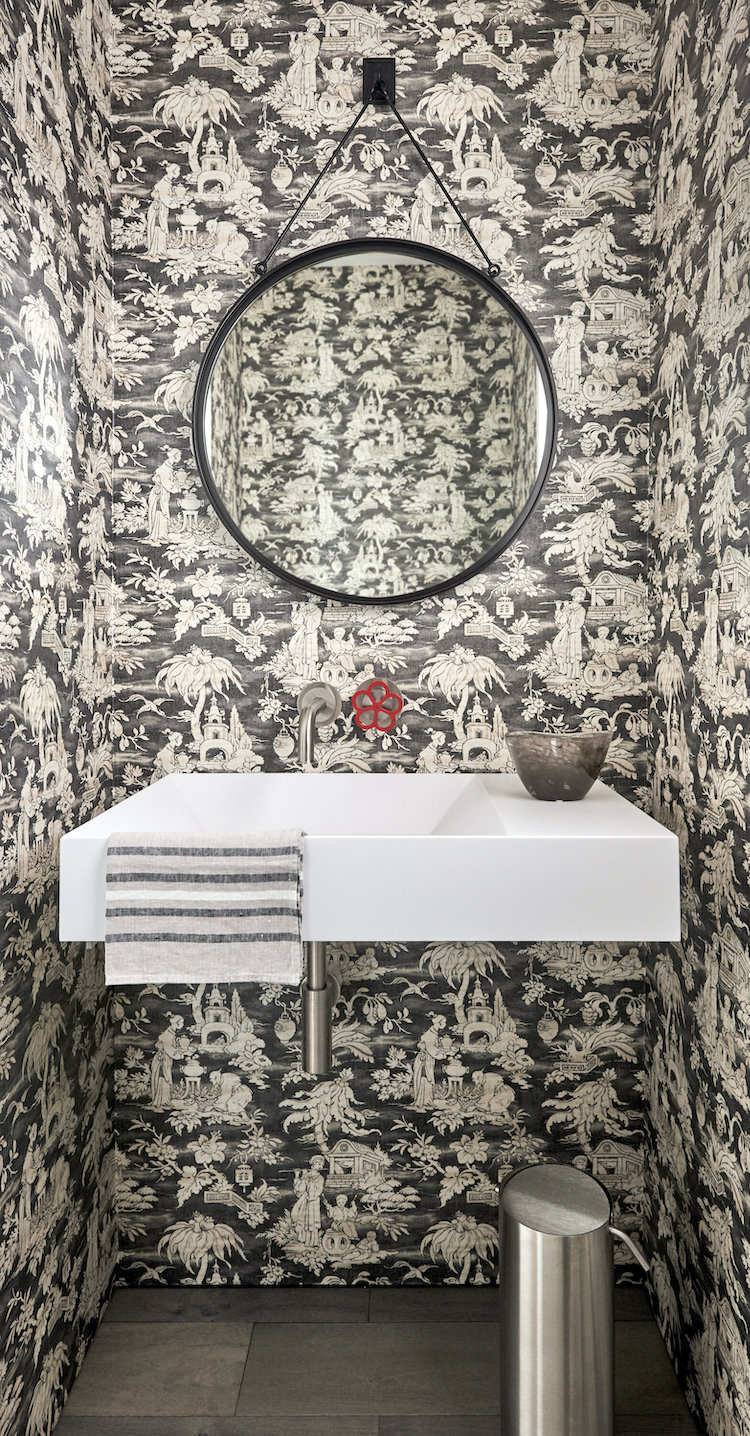 Wallcovering | Ylang silk chinoiserie from Jim Thompson • Sink | BOFFI • Photo | Jeff Johnson