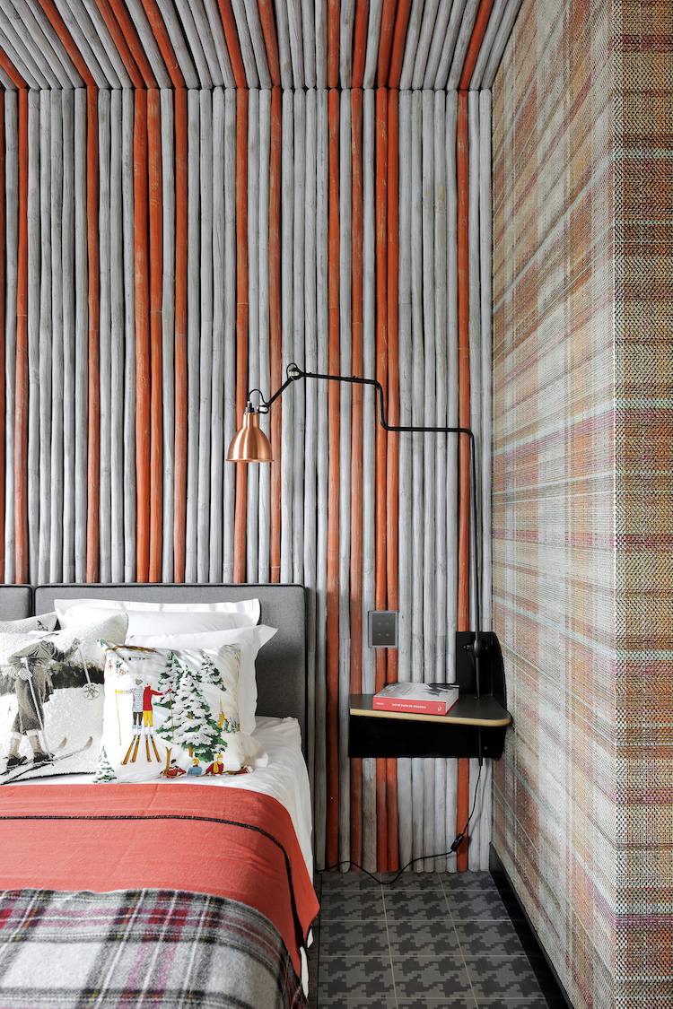 Tartan Wallpaper | Élitis • Flooring | Bisazza • Gras bedside lamp | DCW Editions • Pillow fabric | Pierre Frey • Throw | Pendleton • Back wall and ceiling lined with peeled and painted chestnut stakes • Photo | Frenchie Cristogatin