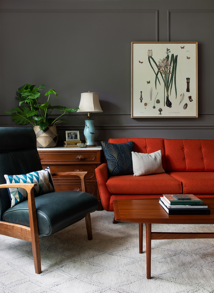 Paint | Down Pipe by Farrow & Ball • Glenn Walnut Leather Recliner | Rejuvenation • Coffee table | vintage • Pillows | The Founder Collection from Bandd Design • Sofa, rug, lamp and artwork | Client owned • Photography Molly Culver