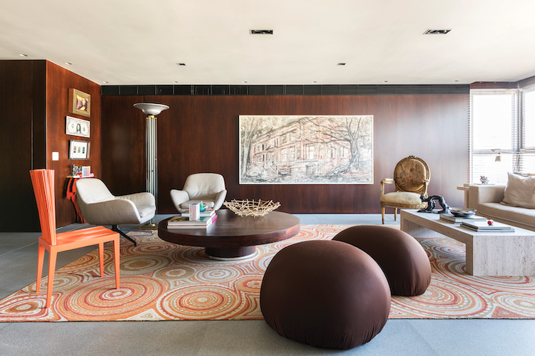 Fabric Poufs, coffee table | Moreira Do Valle • Armchairs | Minotti • Couch | B&B Italia • Janette chair, sushi carpet, bamboo fruit bowl | Campana Brothers • Red side table | ibride • 18th-Century Louis XV armchair | Began’s Antiquario • Painting | Paulo Von Poser • Sculpture | Florian Raiss • Photography | ©Rafael Renzo / Alicja Trusiewicz
