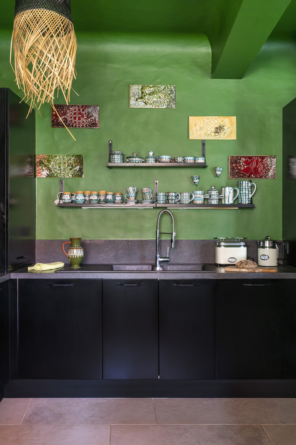When Paris-based Safia Bendali — a former brand ambassador for Ladurée, the historic Parisian pâtisserie famous for its colorful macarons — and her husband Bruce found themselves a vacation property in the impossibly picturesque village of Ansouis, 18 miles from Aix-en-Provence, she was determined to make a comfortable home keyed to the relaxed ambiance that pervades this corner of France. Pictured here, the color of Bendali’s kitchen resembles pistachio nuts. Photography: Bénédicte Ausset Drummond; Stylist: Sylvie Thébaud.