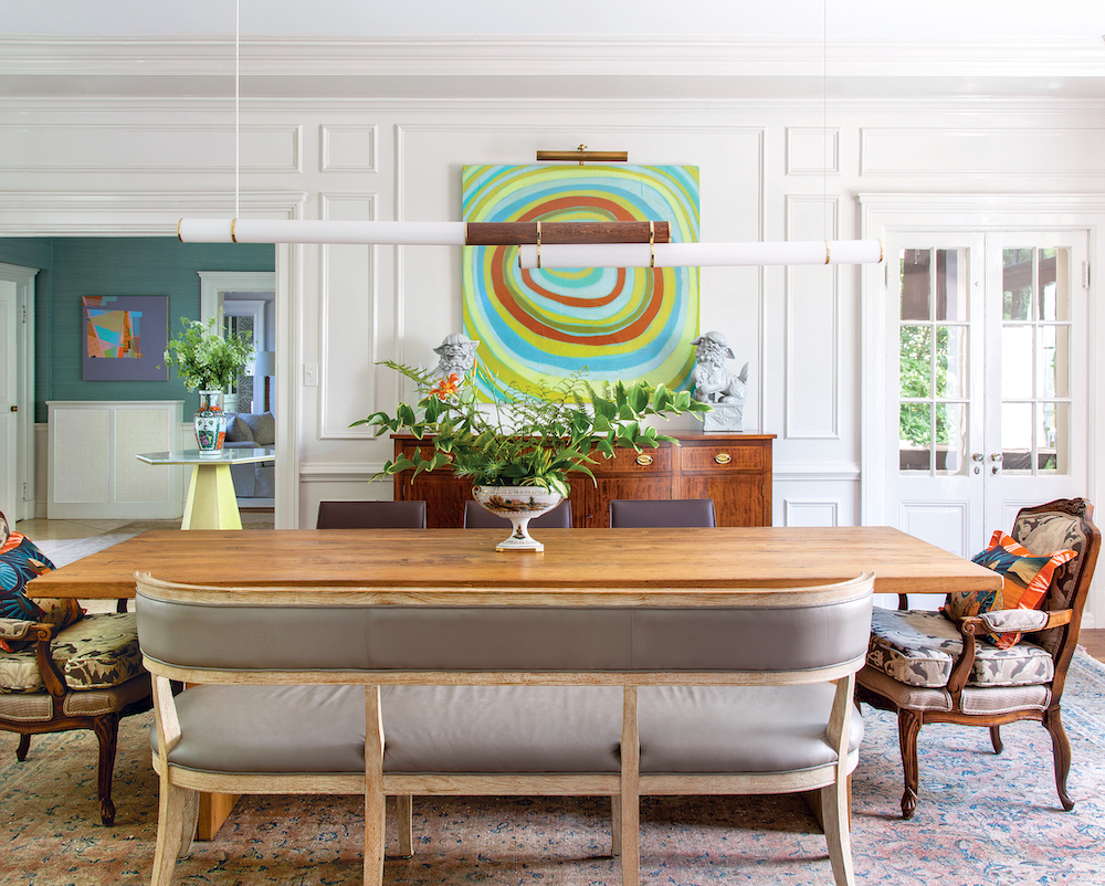 Old meets new in this dining room designed by Anne Hulcher Tollett of Hanover Avenue as part of an historic house renovation in Richmond, Virginia. Originally a dark-paneled room, the lacquered Ammonite Farrow & Ball paint brightened the space alongside fully reconstructed millwork. The old French chairs and a new bench surround a modern-style table alongside an antique sideboard found at auction. Alongside the contemporary art by a local artist found by the homeowner, the room is crowned by a Mini Endless Double Pendant designed by Roll and Hill. Photography: Helen Norman.