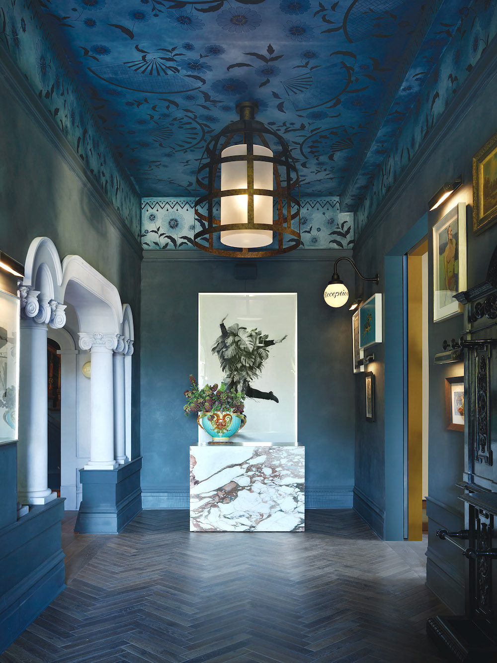Sonoma County’s newest boutique hotel, designed by celebrated designer Jay Jeffers, features this grand hallway that greets guests with 14-foot ceilings hand-painted by artist Willem Racké with an Aesthetic Movement inspired by transferware from that period. The property’s original hostess stand remains, but with a reimagined look. Photo by Matthew Millman.