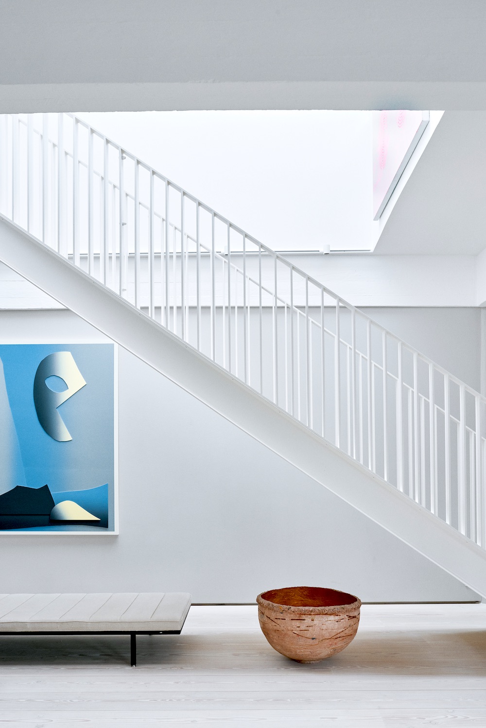 VIPP owner Jette Egelund has made her home in a former pencil factory with a beautiful combination of personal belongings, classic furniture and design from her own company. The blue painting by Mexican artist Carlos Amorales, acquired from the Danish art gallery Nils Stærk, is a personal favorite. The daybed is from the VIPP furniture collection, while the large floor pot is by Danish artist Birgit Østergaard. – Mille Collin Flaherty.
