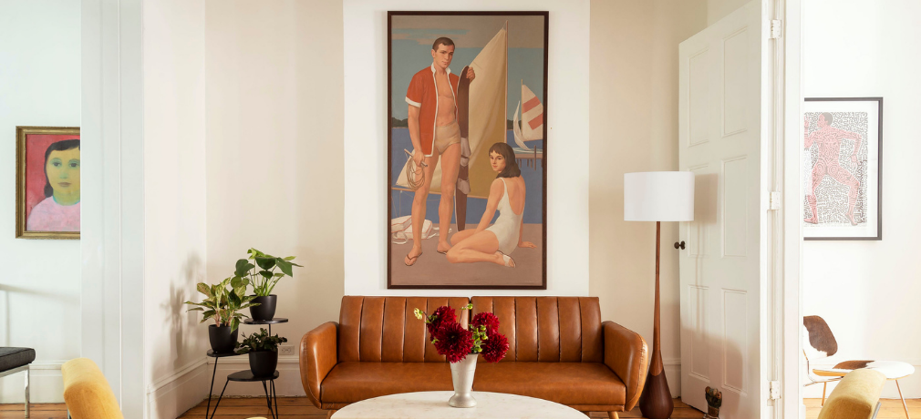 Brittany Futon, Ciara Chair, Athena Plant Stand and Harrington Floor Lamp | All From The Novogratz Collection • Art | White Goose Estate Sales, Hamptons • Marble Table | Vintage Find • Rug | One-of-a-Kind Vintage • Photo by Matthew Williams