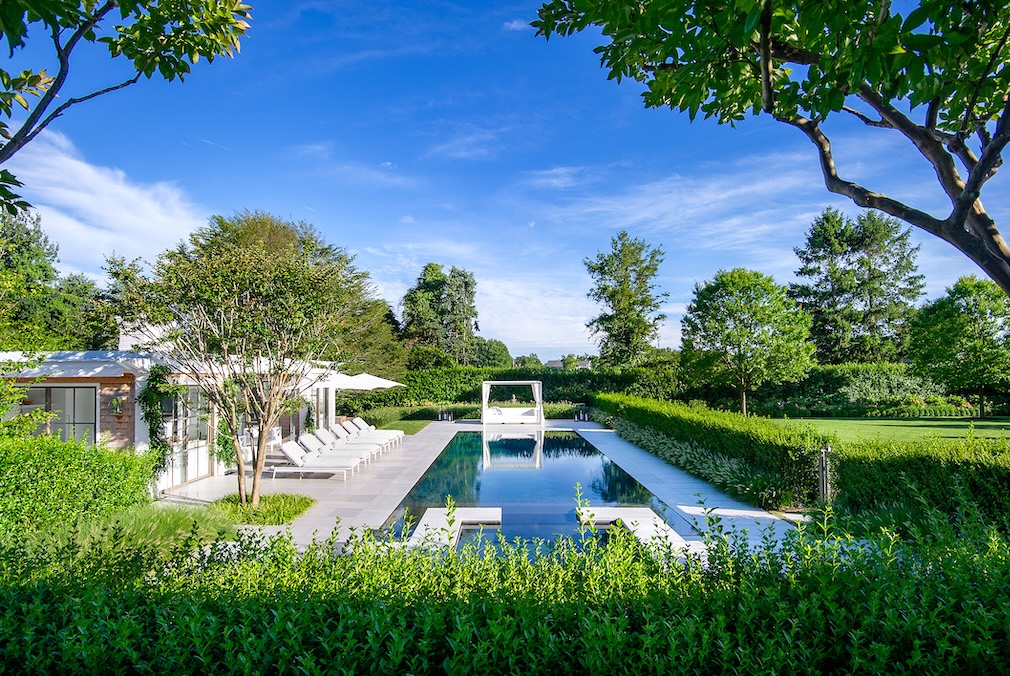 Zero-edge pool. The two buildings (one a kitchen, the other bath and dressing rooms) shelters an outdoor living room with furniture by Roger Thomas, Vondom, McKinnon and Harris and Tuuci (umbrellas). Landscape: LaGuardia Design Group; Photo: Karen Fuchs.