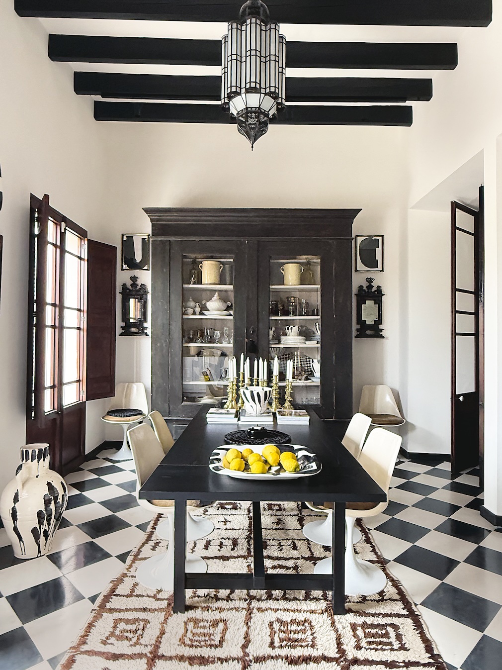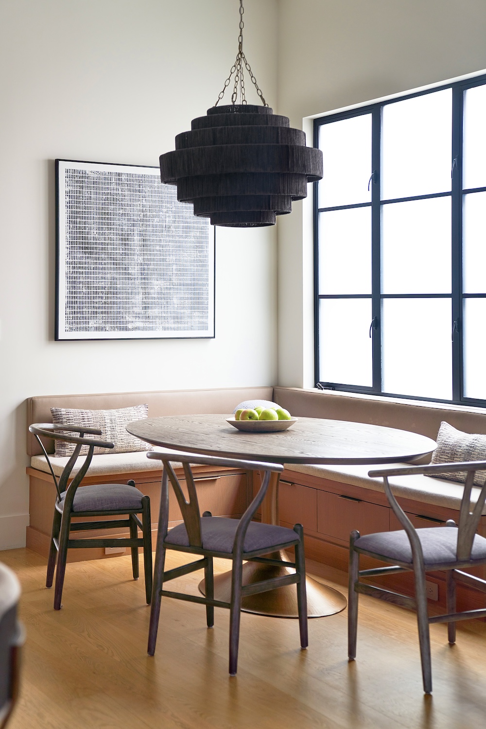 In a nook designed for connection, layered natural tones are grounded by black accents and natural textures. Taking pride of place, the Everly chandelier by Palecek in a deep charcoal tone adds graphic punch. The custom banquette is covered in fabric from Palecek and leather from Kravet. An RH table is surrounded by chairs from Arhaus.