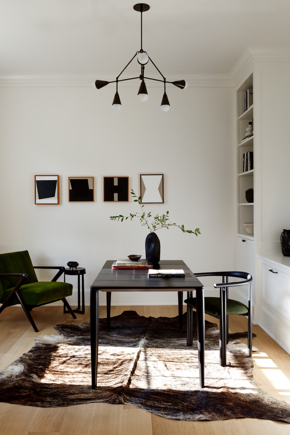 In a 1910 home in the historic Cleveland Park neighborhood in Washington D.C., a serene study blends sculptural midcentury silhouettes, rich green upholstery and graphic black accents to create a modern yet timeless workspace.