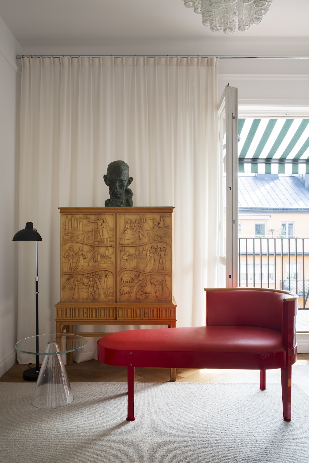 Sverlanders’ own 592-square-foot apartment on Kungsholmen Island, Stockholm, Sweden. Carl Milles bronze bust of Gustav Stridsberg. Mid-20th-century cabinet by Eugen Höglund, Vetlanda, Sweden. Murano lamp from Sjöström Antik. Chaise lounge by Mats Theselius in Ferrari red.
