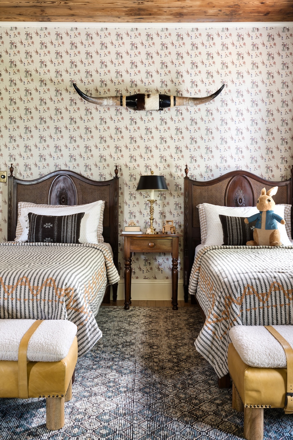 “This shared boys’ room was inspired by the family’s Texas roots, featuring vintage cowboy charm through a modern lens,” shares Cathryn Lindsey. “We started with a cowboy wallpaper that was customized to resemble a vintage toile print, then layered it with antique cane headboards, personal family heirlooms, and incorporated a mix of modern patterns and natural textures. This resulted in a space that feels both playful and refined, striking the perfect balance between whimsy and sophistication.”