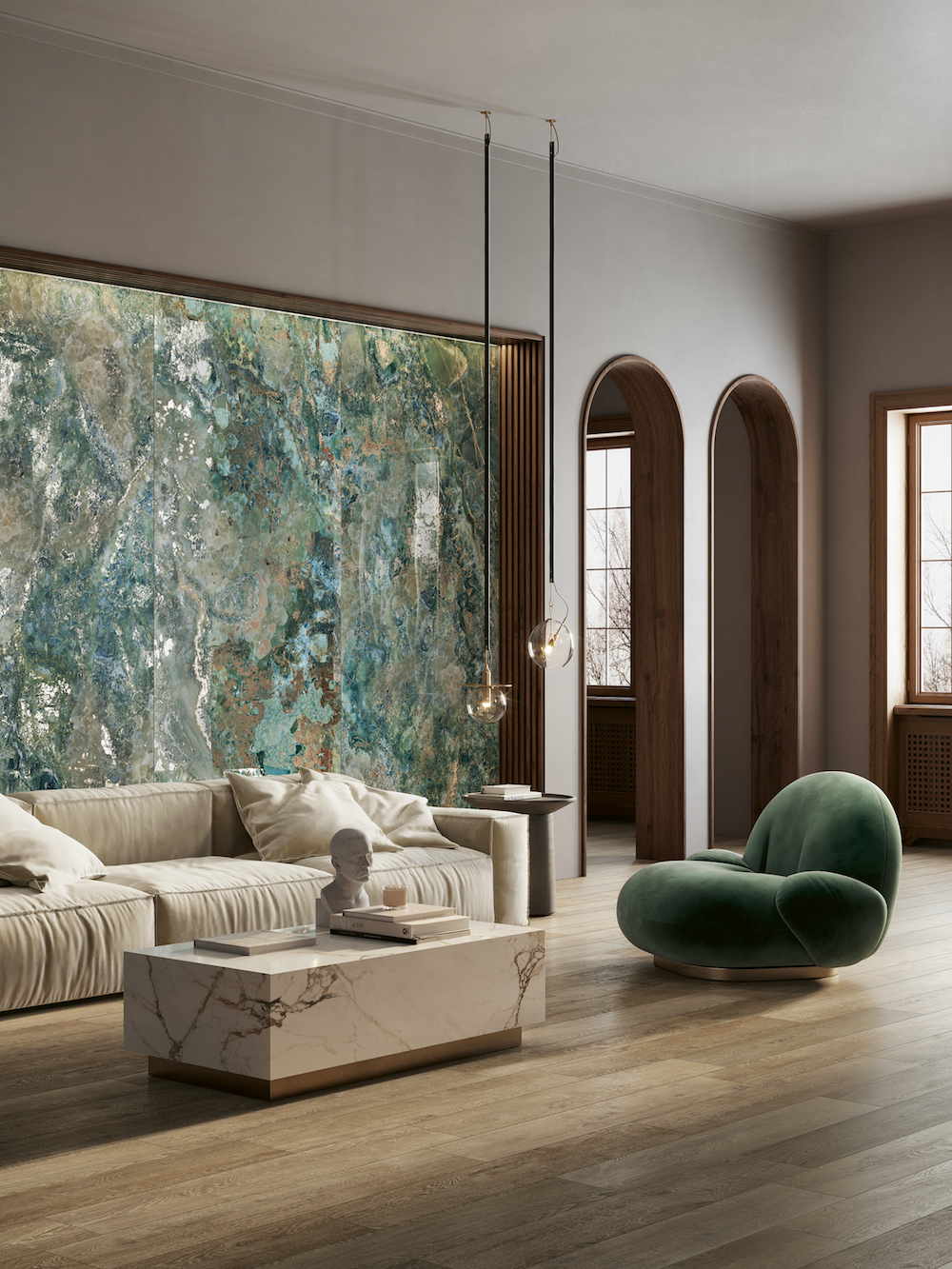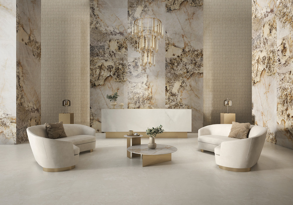Organic Grandeur: Innovative glazing technology paired with inspiration from rare natural materials results in surfaces so stunning you’ll lose your gaze in them. Enhancing effects of light and reflectivity are reproduced in luminous finishes, giving the beauty and depth of marble with the durability of porcelain in color ranges wider than those of natural stone.
