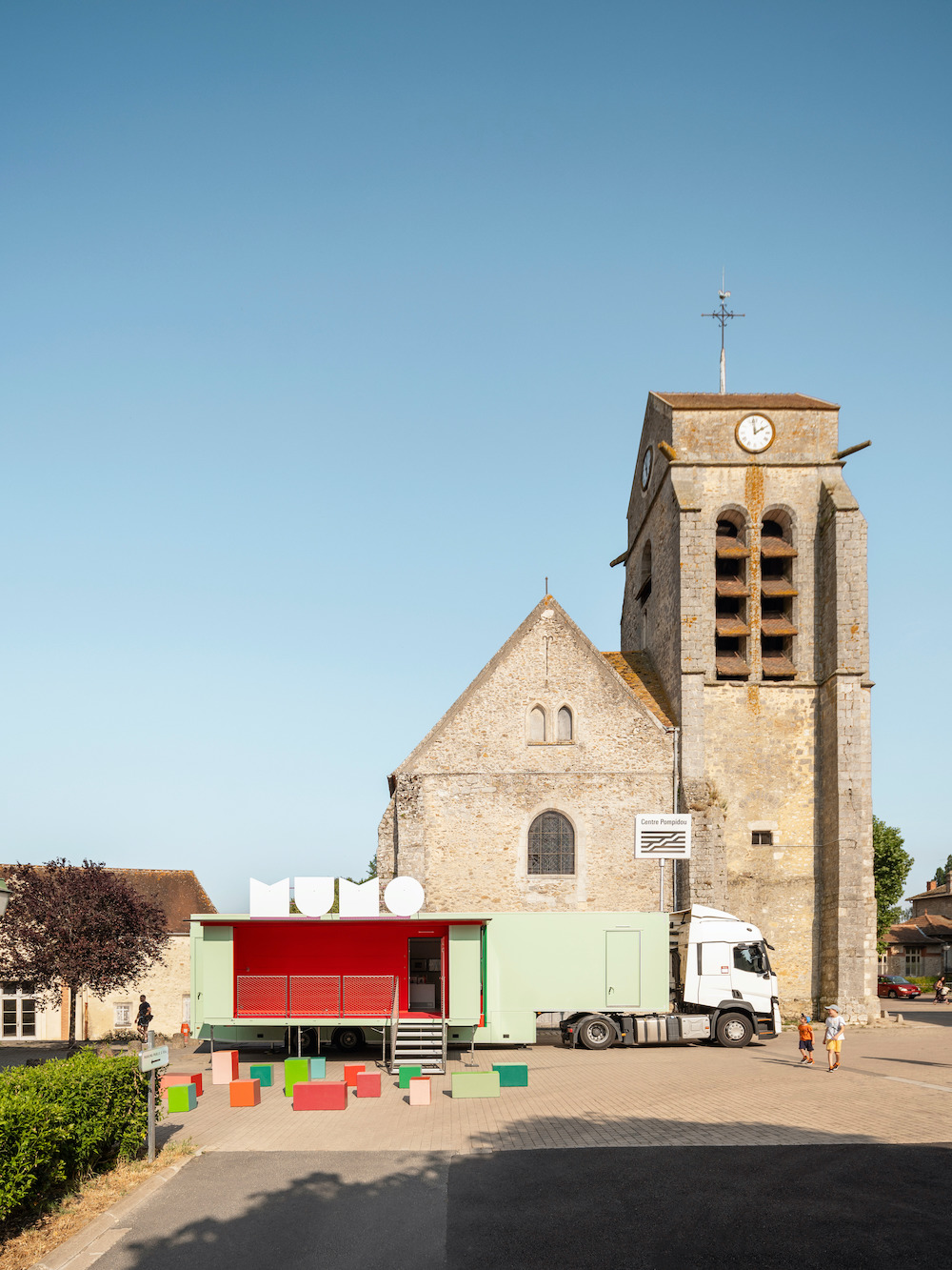 The arrival of the truck in village squares, parking lots, parks, or any other public space is greeted with fanfare. Small wonder, as it evokes fairground architecture on wheels. The side drawers of the truck come out, with several panels unfolding horizontally and vertically to form a front porch. The staircase is then put in place.