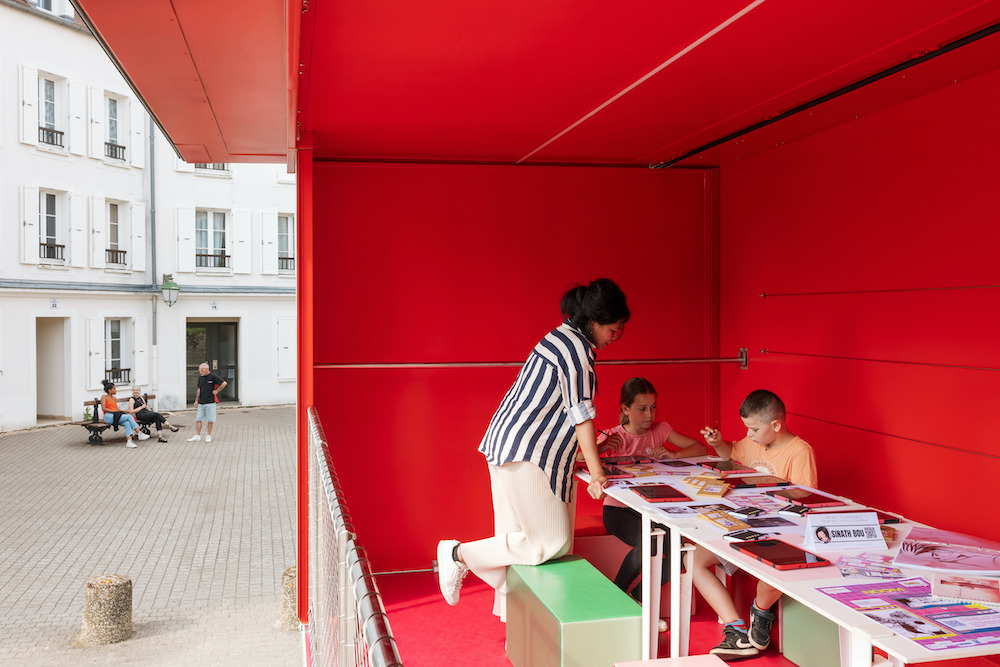 The interior color of the loggia is revealed when it is unfolded: the bright red contrasts with the green facade, highlighting this welcoming space that opens onto the public space. Inside, the alcove is also a colorful space. Its faces are different shades of green that contrast with the white of the exhibition room.