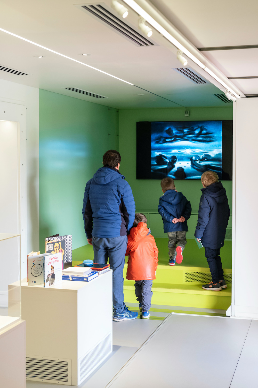The contrast in color between the different spaces accentuates the difference in status: the colored rooms are spaces in movement that are mutable and reconfigurable. The exhibition room, entirely white, is a place to pause, concentrate, contemplate, and be soothed.