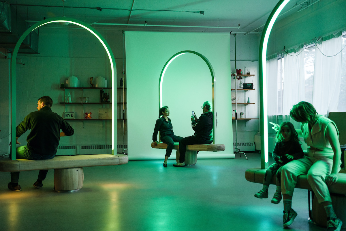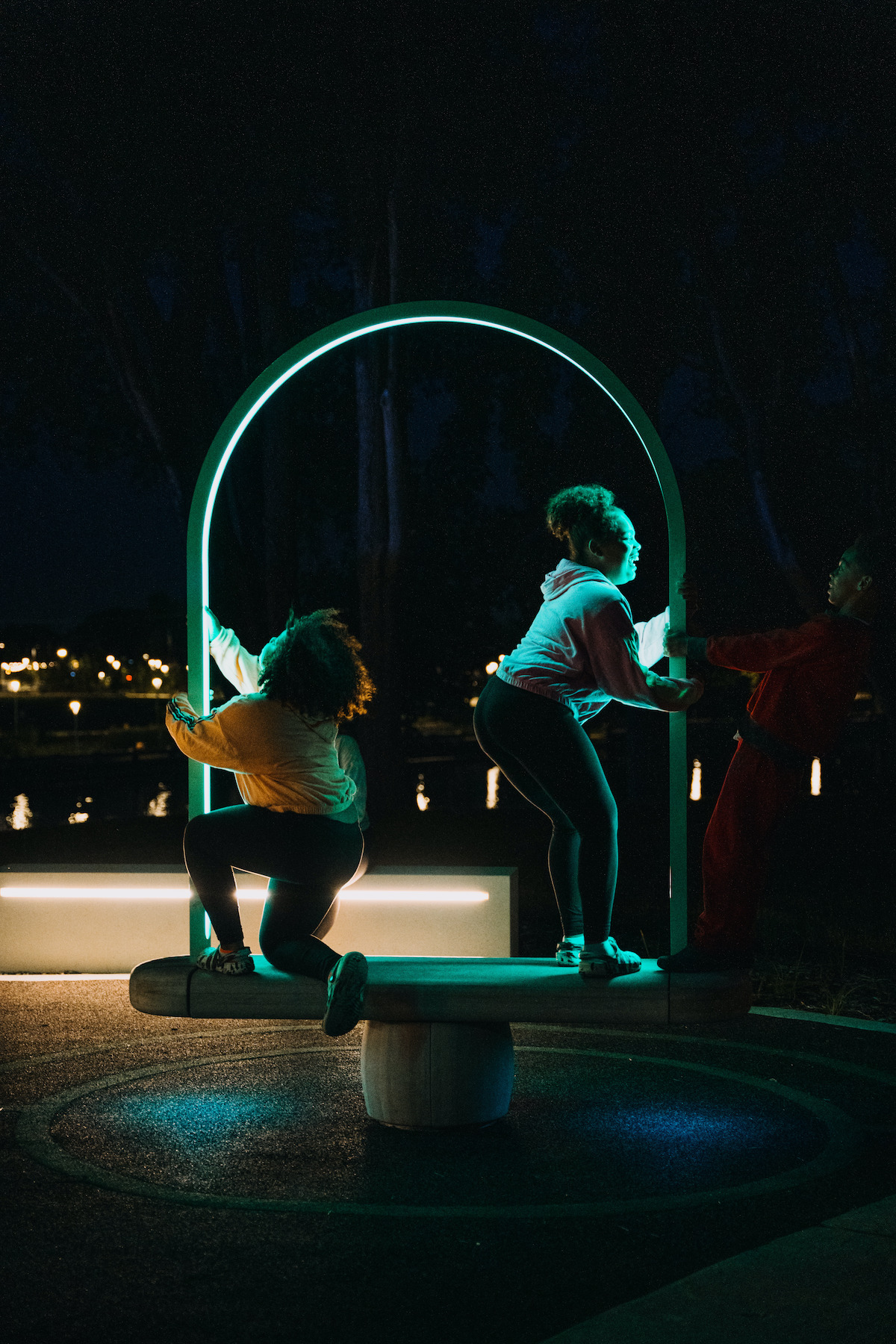 A set of revolving long benches host a sound and sensing system. Each bench accommodates up to four people and is finished in Canadian white oak, with a powder-coated aluminum arch. Interactive LED lights are integrated in the arch and under the seat to emphasize movement.
