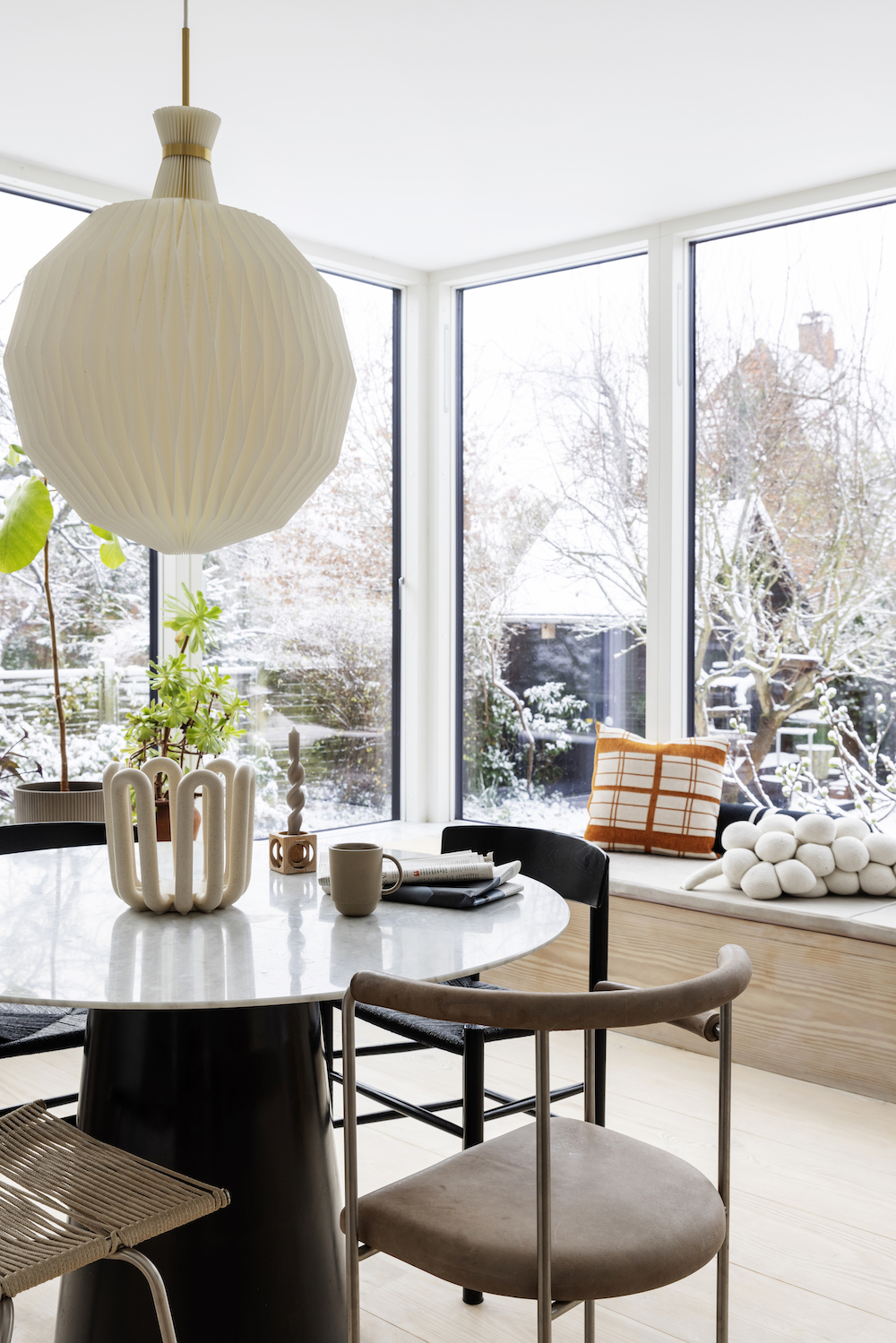 While they appreciate every space in the newly revitalized abode, Dam especially loves the open, light-filled dining room overlooking the garden. There, a large plastic globe chandelier appears to float over a black metal pedestal table with a crisp white marble top. Mismatched chairs and a built-in window seat complete the scene. “When we open up the windows, it feels like we’re outside,” she notes. “It’s a wonderful spot.”