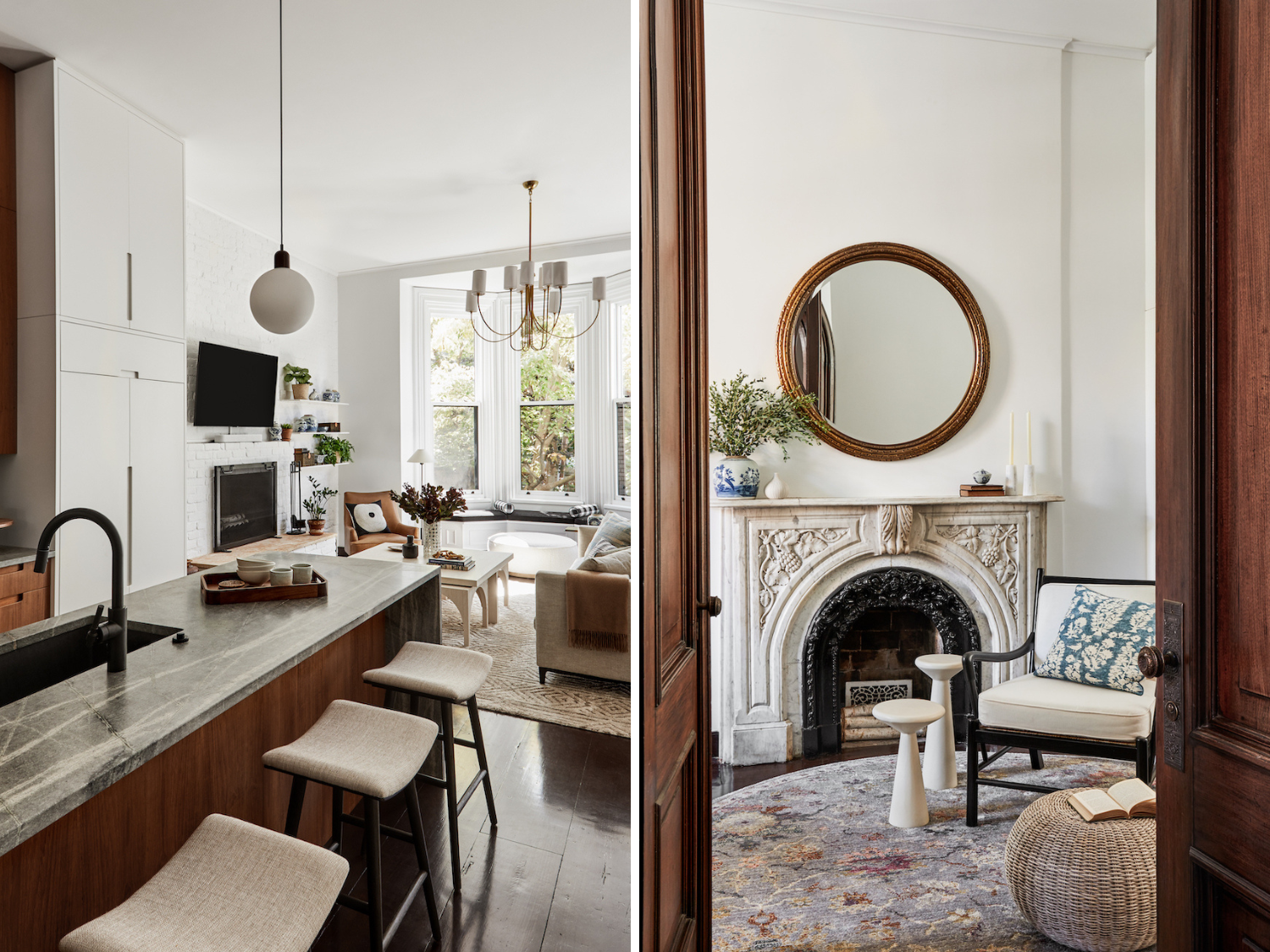 High ceilings, tall windows, rich millwork and handsome fireplaces give the owner’s unit a sense-pleasing solidity. Rak’s choices reflect and complement these enviable details, creating an understated environment tailored to everyday life. The dining area – set with a concrete table from Four Hands and walnut-stained, rubber wood chairs from Nuevo – is perfect for a solo lunch or convivial dinner party. Rak fashioned a foyer area on the parlor floor, outfitting the space with a round, floral rug from Loloi and diminutive occasional tables and a reeded pouf from Four Hands. Responding to the existing walnut cabinets and gray quartzite countertops in the kitchen, he populated the adjacent living room with casual, earth-toned pieces. Trendy and buoyed by tech, Brooklyn is giving Manhattan a run for its money as a place to live. But sitting here, “hip” seems far away, and home is what it’s all about.