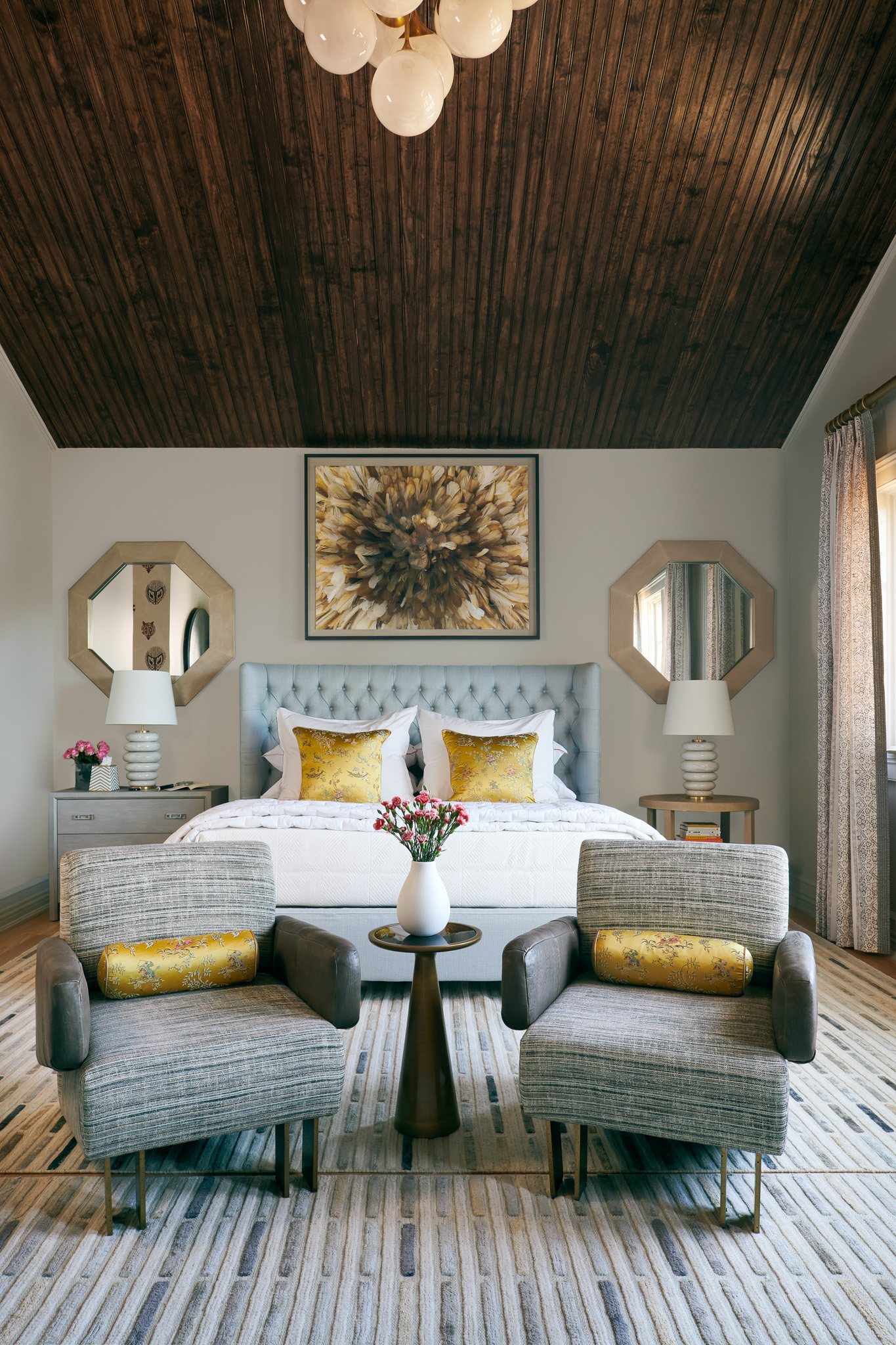 In the bedroom, a soft color palette leads the eye up to the dark stained ceiling, where a Circa Lighting chandelier takes center stage.