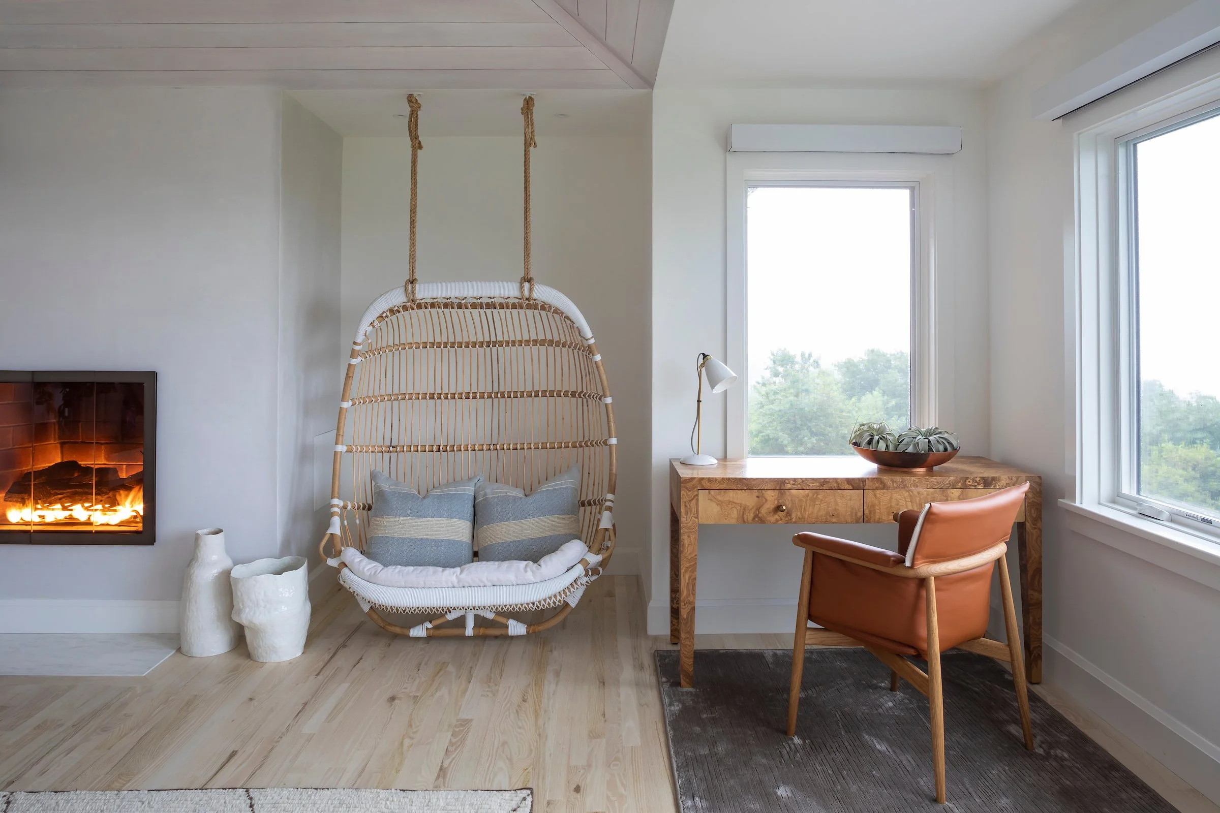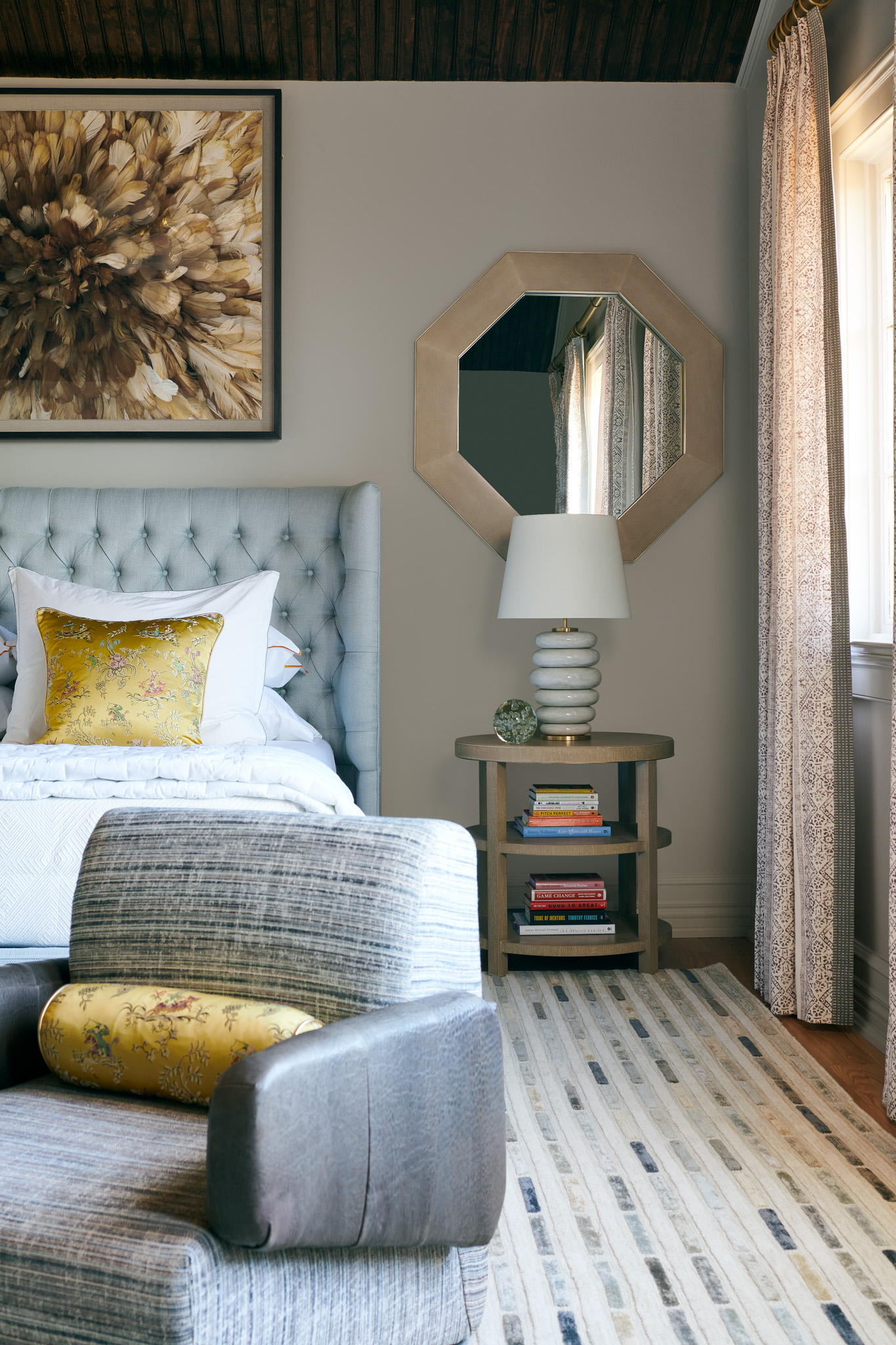Most Furnishings, Rug & Art: Mitchell Gold & Bob Williams | 2 Chairs: Kelly Wearstler | Paint: Benjamin Moore | Wallpaper: The Vale London Fabric: Fabricut | Lighting: Circa Lighting