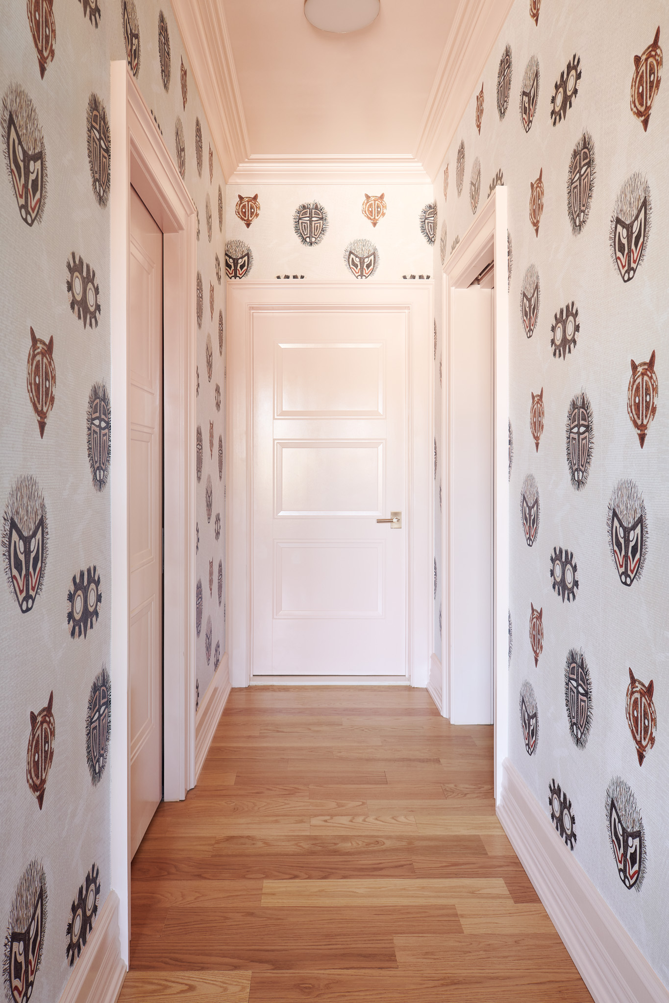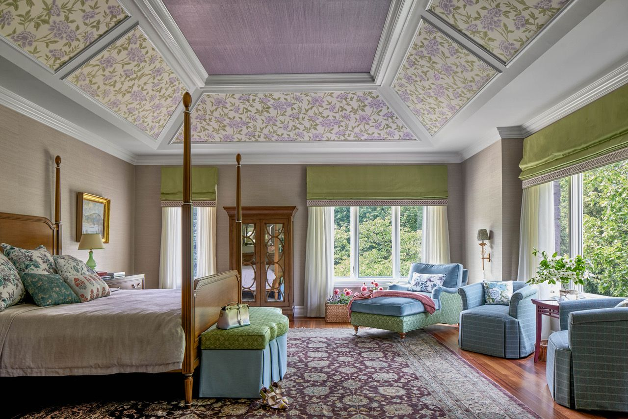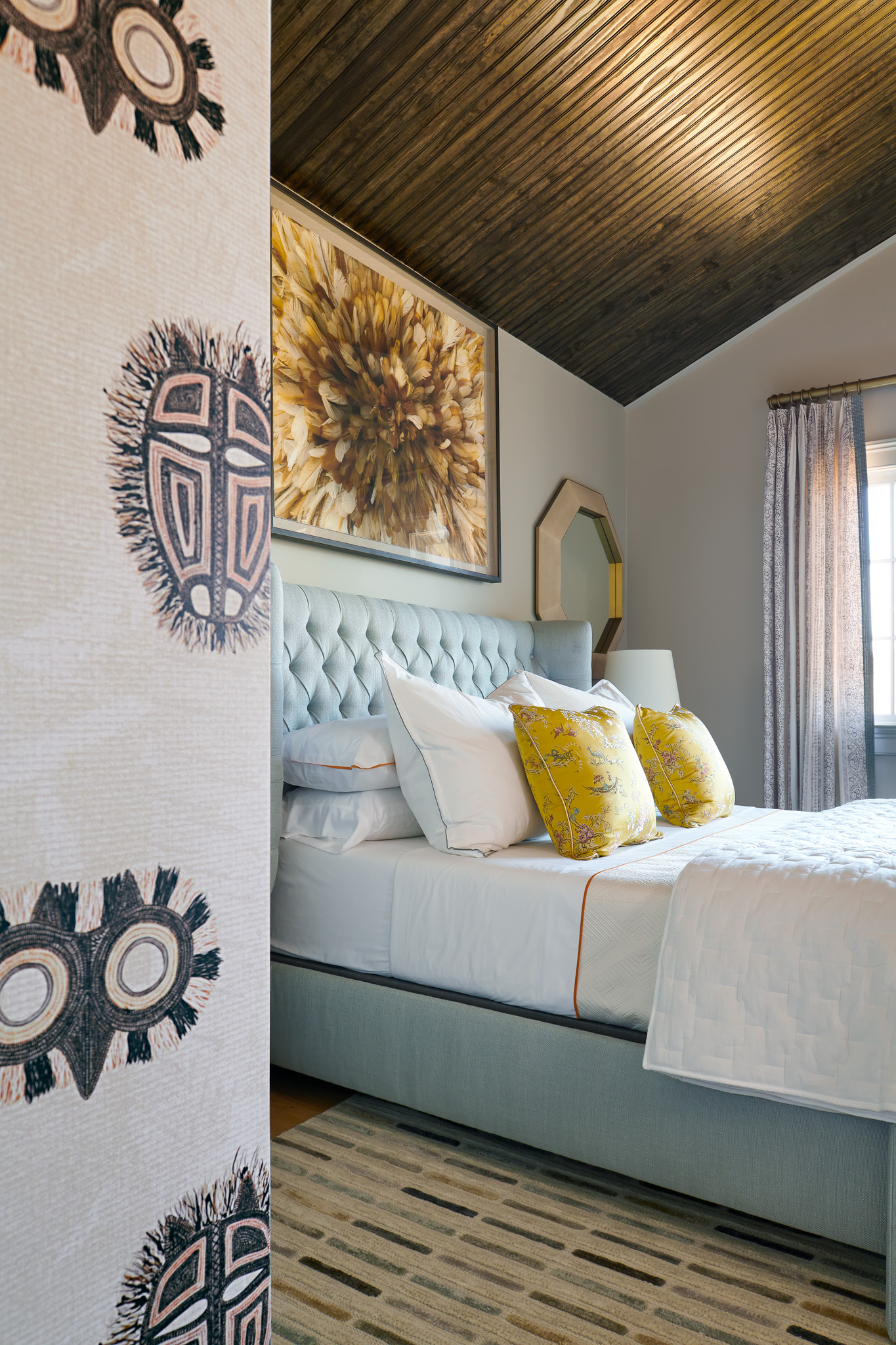 Inspired by the breast cancer research campaign’s signature pink, Davis painted the ceiling in the hallway leading to the master bath Benjamin Moore’s 2020 color of the year, First Light. The rosy hue is flanked by the graphic mask illustrations of The Vale’s Panamania wallpaper.