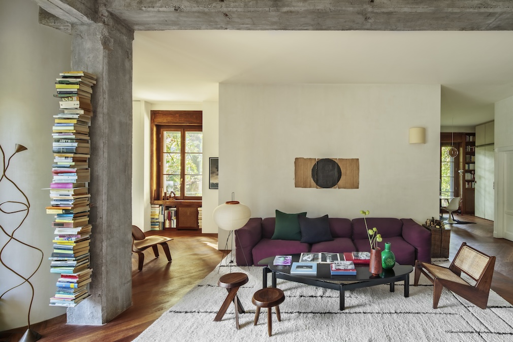 While the apartment is amply appointed with signature pieces of 20th-century design – Eero Saarinen’s Tulip Chair, the LCW armchair created by Charles and Ray Eames, the Toio lamp designed by Achille and Pier Giacomo Castiglioni for Flos in 1962 – the unit does not read at all gallery-like. This is especially true in the welcoming living room, with its Oblong sofa by Jasper Morrison in purple upholstery, wooden stools by Pierre Chapo and Charlotte Perriand, and Kangaroo armchairs by Cassina sitting atop a Moroccan wool rug. Andiamo!