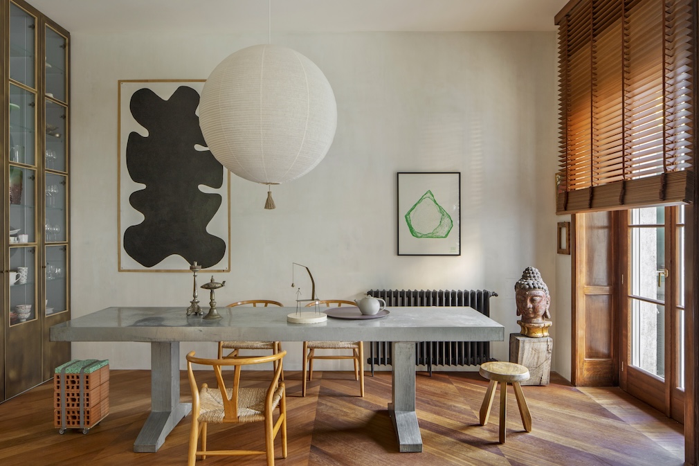 The homeowner, a cosmopolitan who lived in Shanghai and Los Angeles before returning to Italy, assembled a highly individual collection of possessions over the years, which now reinforces the pleasing artlessness that pervades the apartment. The zinc dining table by Dutch designer Piet Hein Eek (originally designed for outdoor use) has been with her for over twenty years. A gold mirror in the bathroom came from her mother’s home, and the tree trunks disposed here traveled from her California garden. The art in the home ranges from a 19th-century Buddha from Cambodia and a bronze sculpture by the innovative polymath Fausto Melotti to works by American photographer Mary des Jardins.