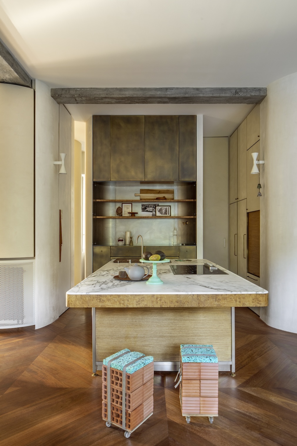 Arguably, the most recognizably “designed” space in the apartment is the kitchen, which features custom-made storage units in steel, burl oak and burnished brass, complemented by a central island with a white Carrara marble countertop, developed by De Amicis Architetti. Although distinctively articulated, the space registers as functional first, stylish second.
