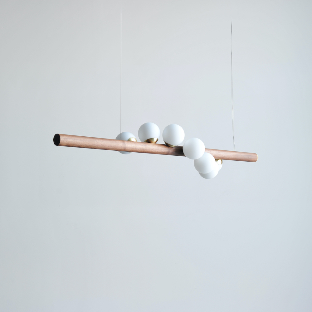 Founder Mischa Couvrette strategically placed several small, glass orbs around a thin piece of wood, creating the illusion of a dainty strand of pearls. Available in two sizes, two orientations, as well as a handful of wood species and metal finishes, it’s possible to create a personalized pendant for your pad.
