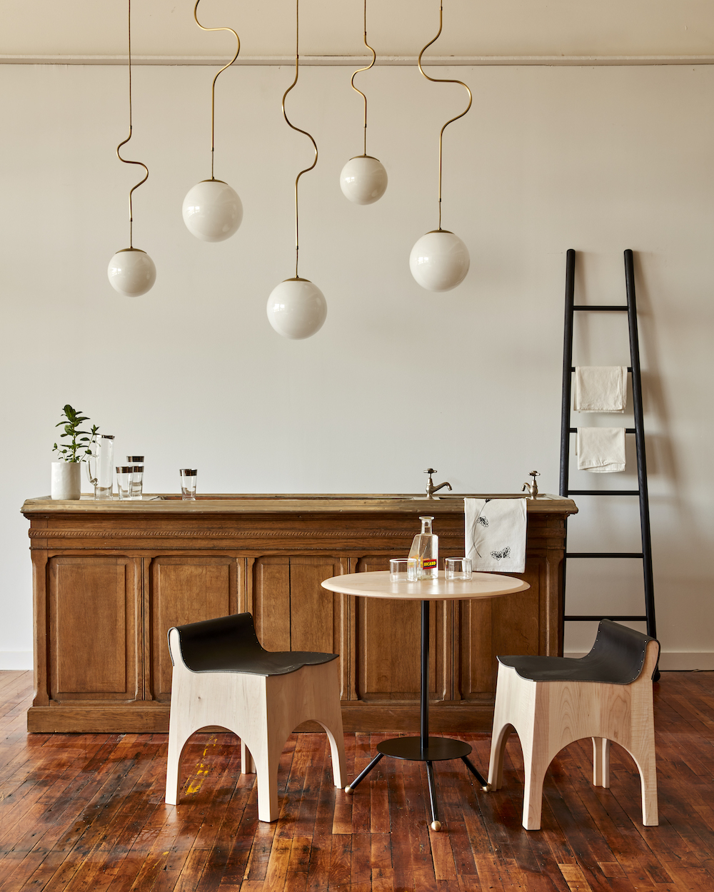Robert True Ogden’s fanciful sketches come to life with the Lawrence Pendant, a playful use of patinated brass and a white glass globe that can be hung solo or in a group. Sleek without being too serious.