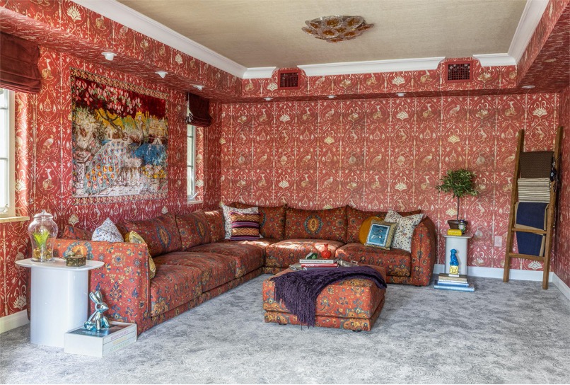 This energetic room has a clear influence of the Impressionist movement, notably drawing inspiration from “The Red Studio” by Henri Matisse. Featured here is a vintage red wallpaper in a damask pattern with animal motifs.