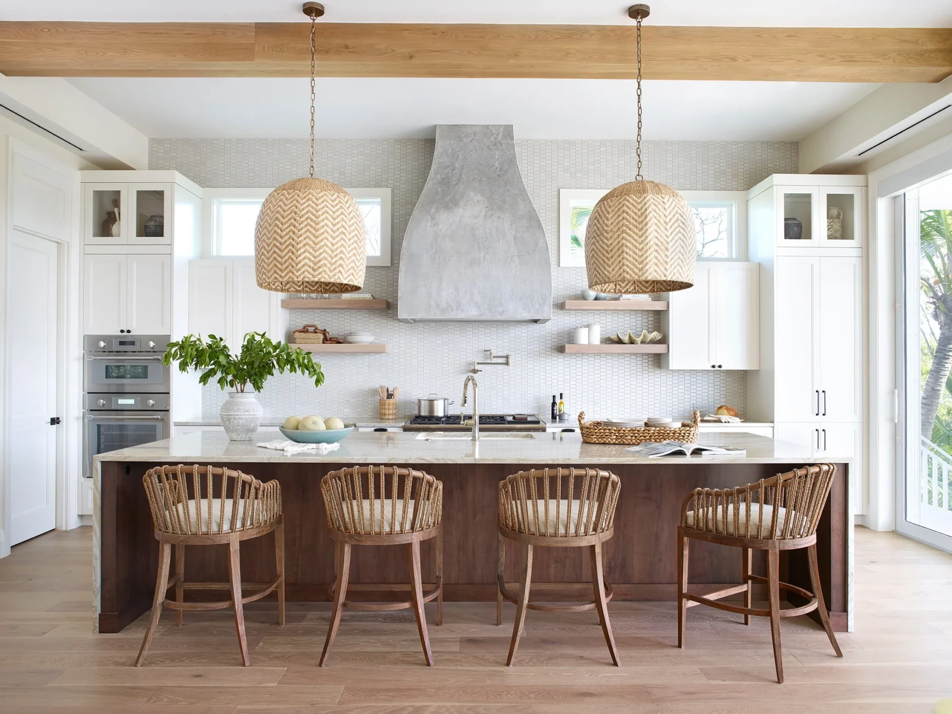 In this light-filled entry, natural materials take the lead, with a rattan-wrapped mirror and beaded fixture adding depth against a restrained backdrop.