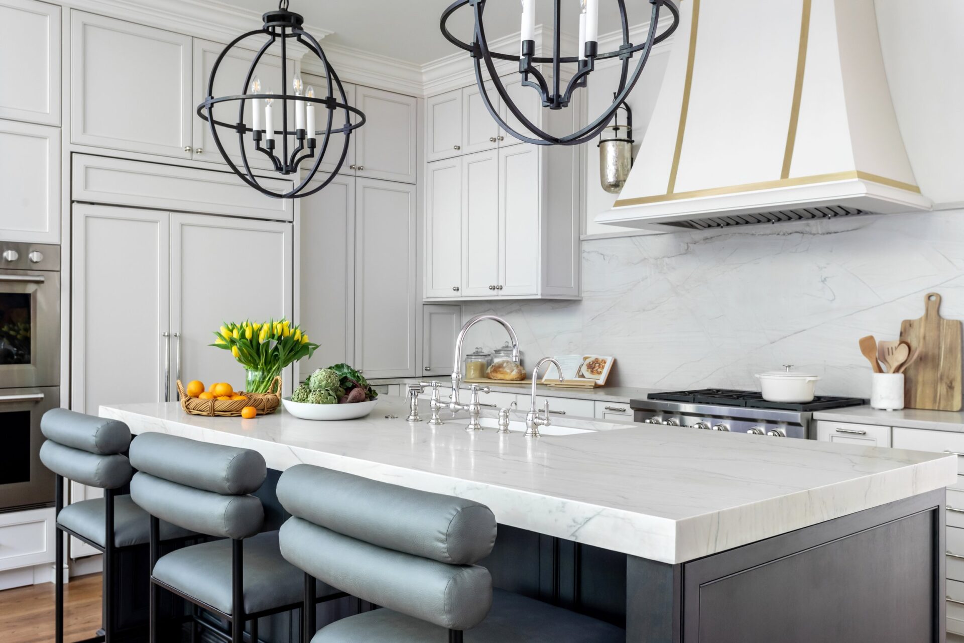 The rich, dark island and matching accents anchor the kitchen’s bright white palette, providing a grounded visual contrast that enhances the warmth of the wooden floors. Together, they create a balanced and inviting space that feels both open and cozy. Photo Credit: Heidi Harris