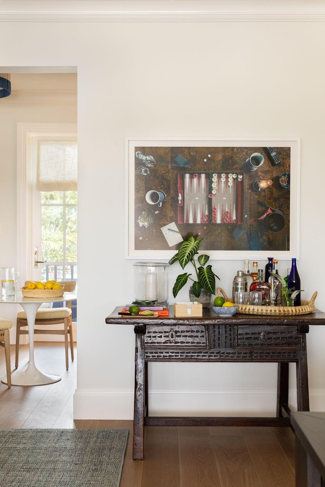 The carved antique console grounds the vignette with history, echoing the rich textures and playful storytelling of the game-night photograph above it.